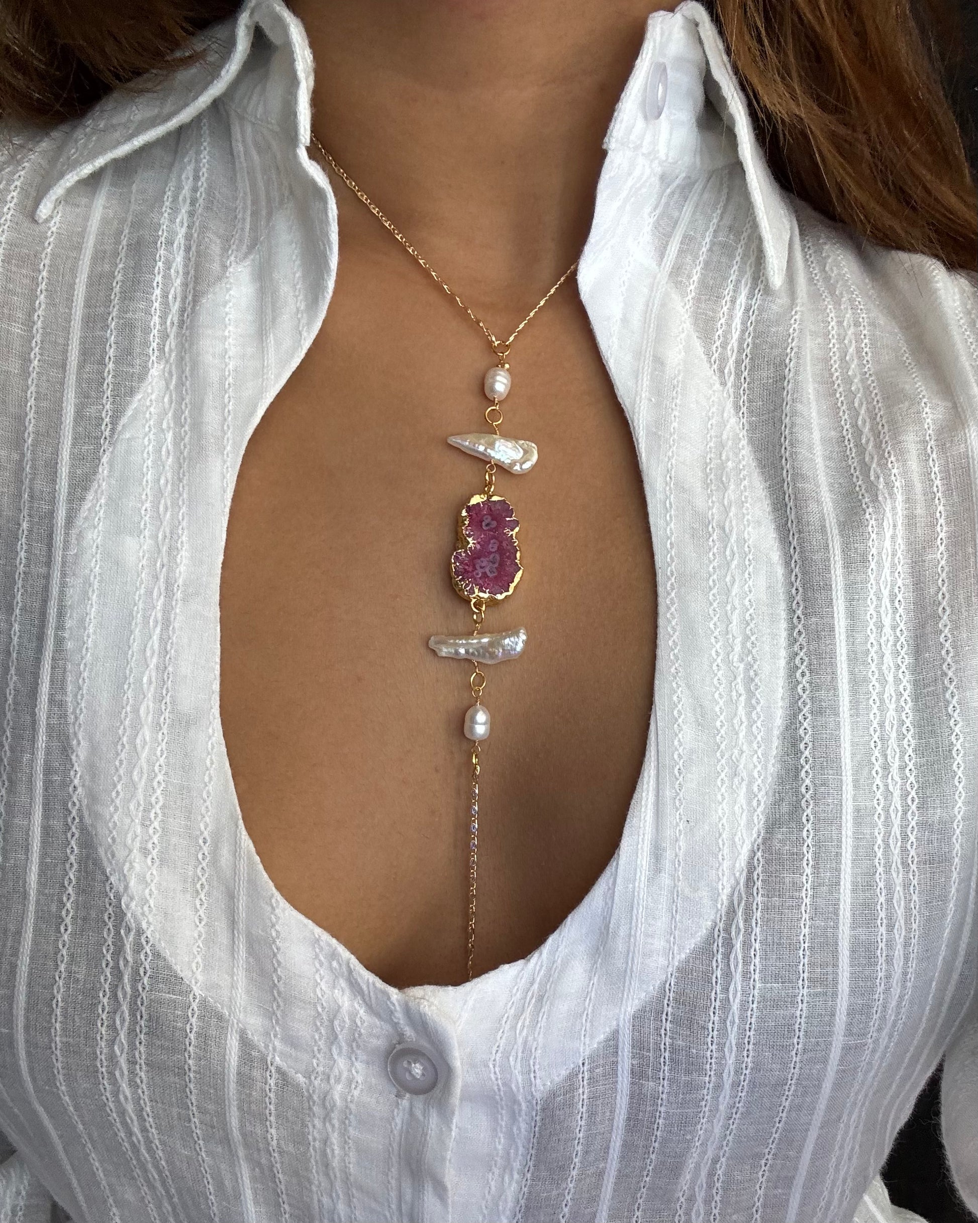 This body chain is made using gold-plated chain, freshwater and freshwater biwa pearls, and natural agate.