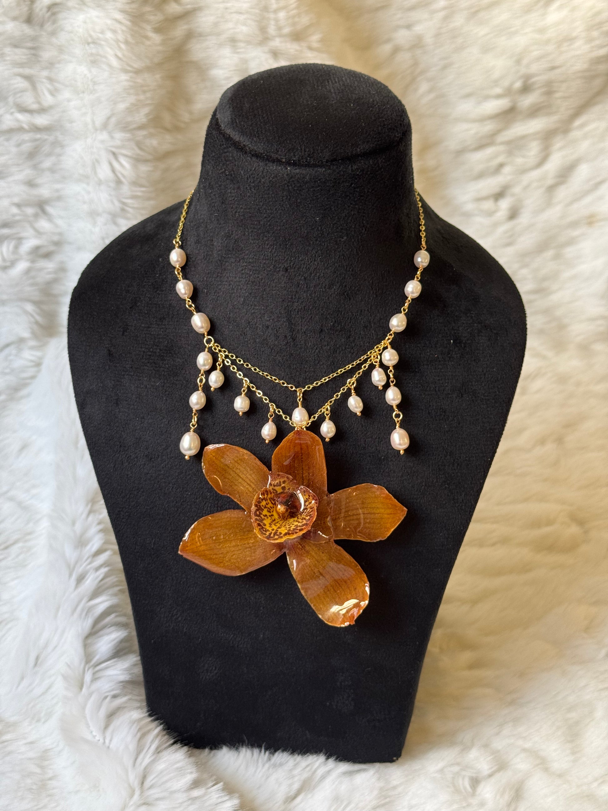 The necklace is made using a hybrid cymbidium orchid carefully preserved forever in resin. The necklace uses some of our most beautiful freshwater pearls, handwired and carefully placed to look like they are floating.