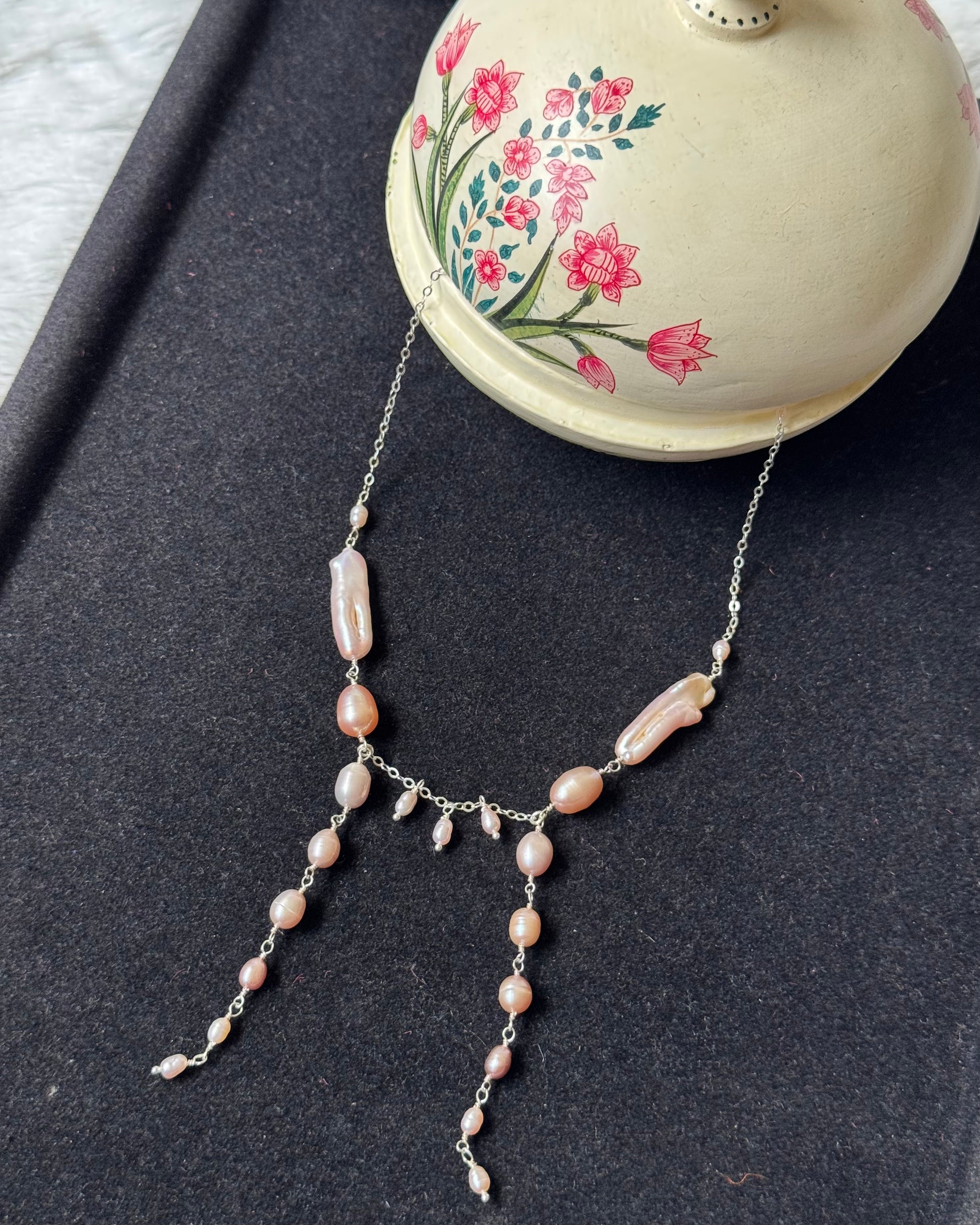 This necklace is made using two biwa freshwater pearls and a variety of freshwater pearls, hand-wired to perfection, for a beautiful descending look on two sides with sterling silver used on every single metal component.