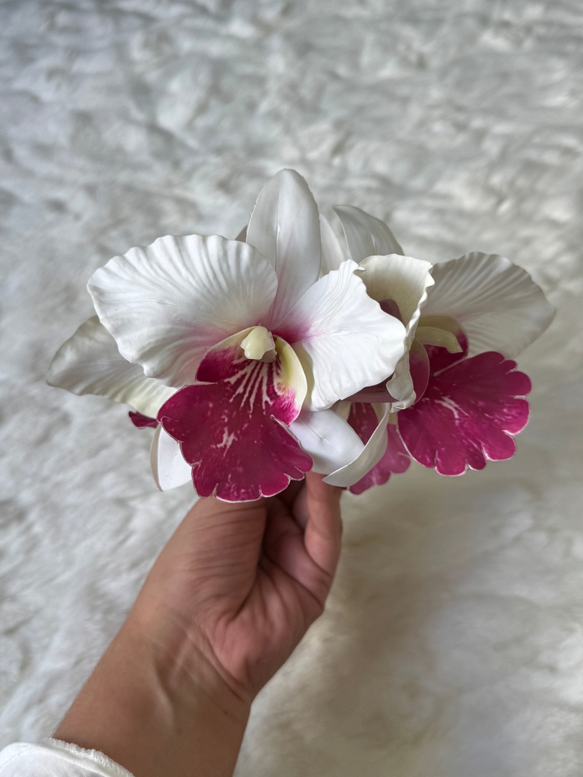 Claw clips with gorgeous cattleya orchids. Claw-Clip base colour may vary (off-white or translucent). This product is available on a pre-order basis, the product will only be shipped out in 5-10 business days. No urgent orders <3