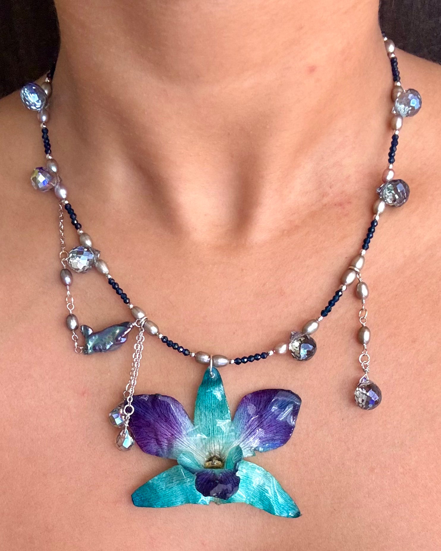This necklace is made using a carefully preserved dendrobium orchid and features freshwater pearls, Swarovski crystals, biwa pearls and gunmetal chain.