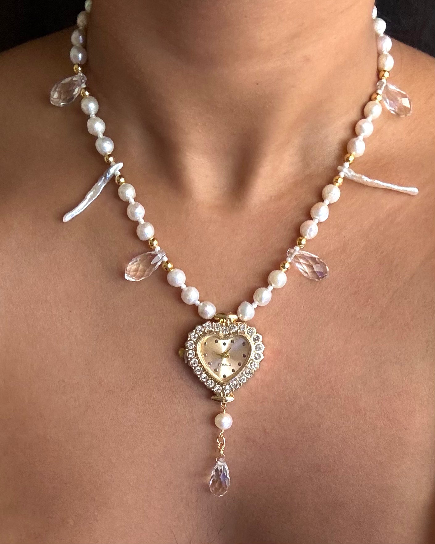 This beautiful necklace is made using a premium gold and zirconia studded functional watch dial, freshwater pearls, biwa pearls, swarovski faceted crystals.