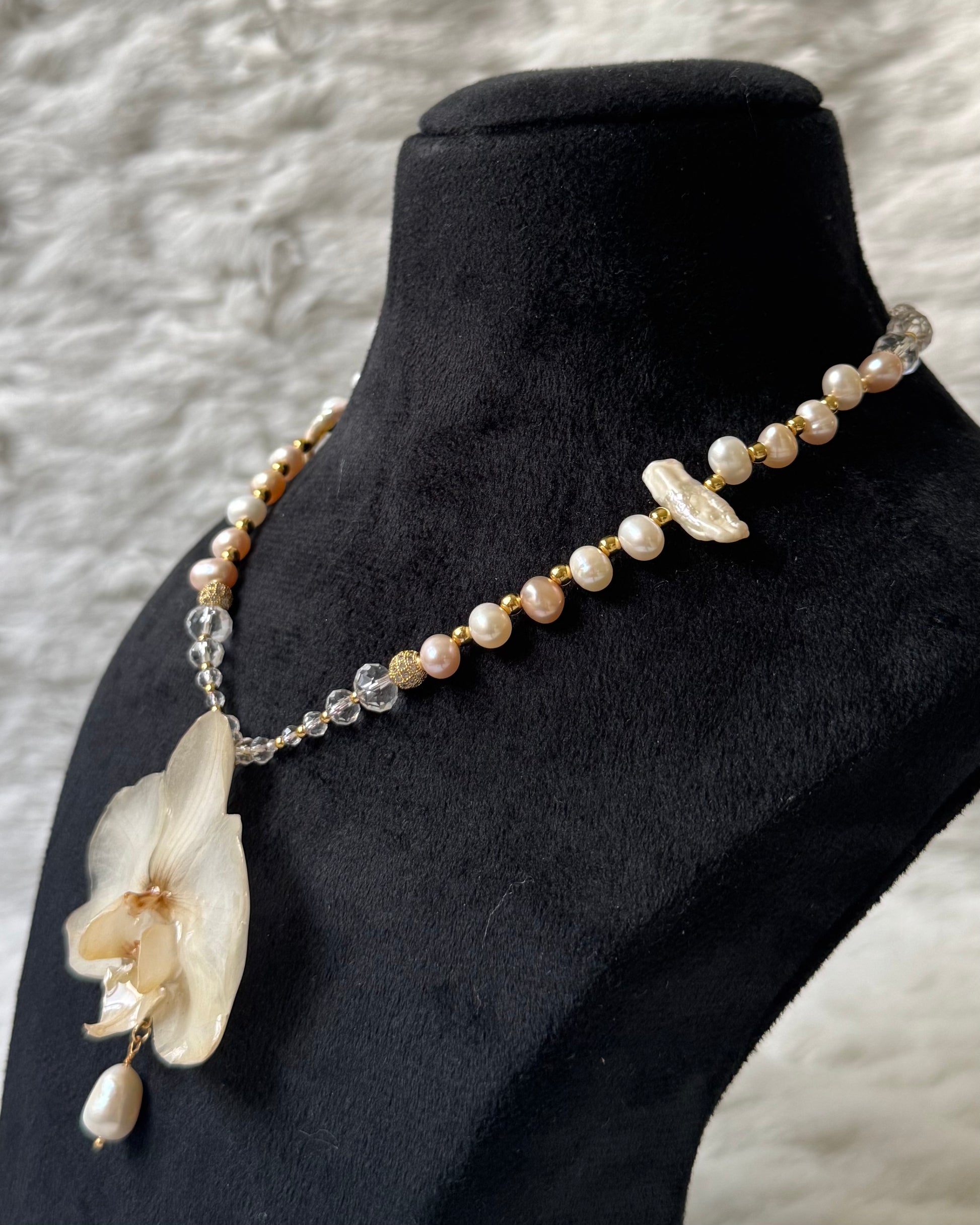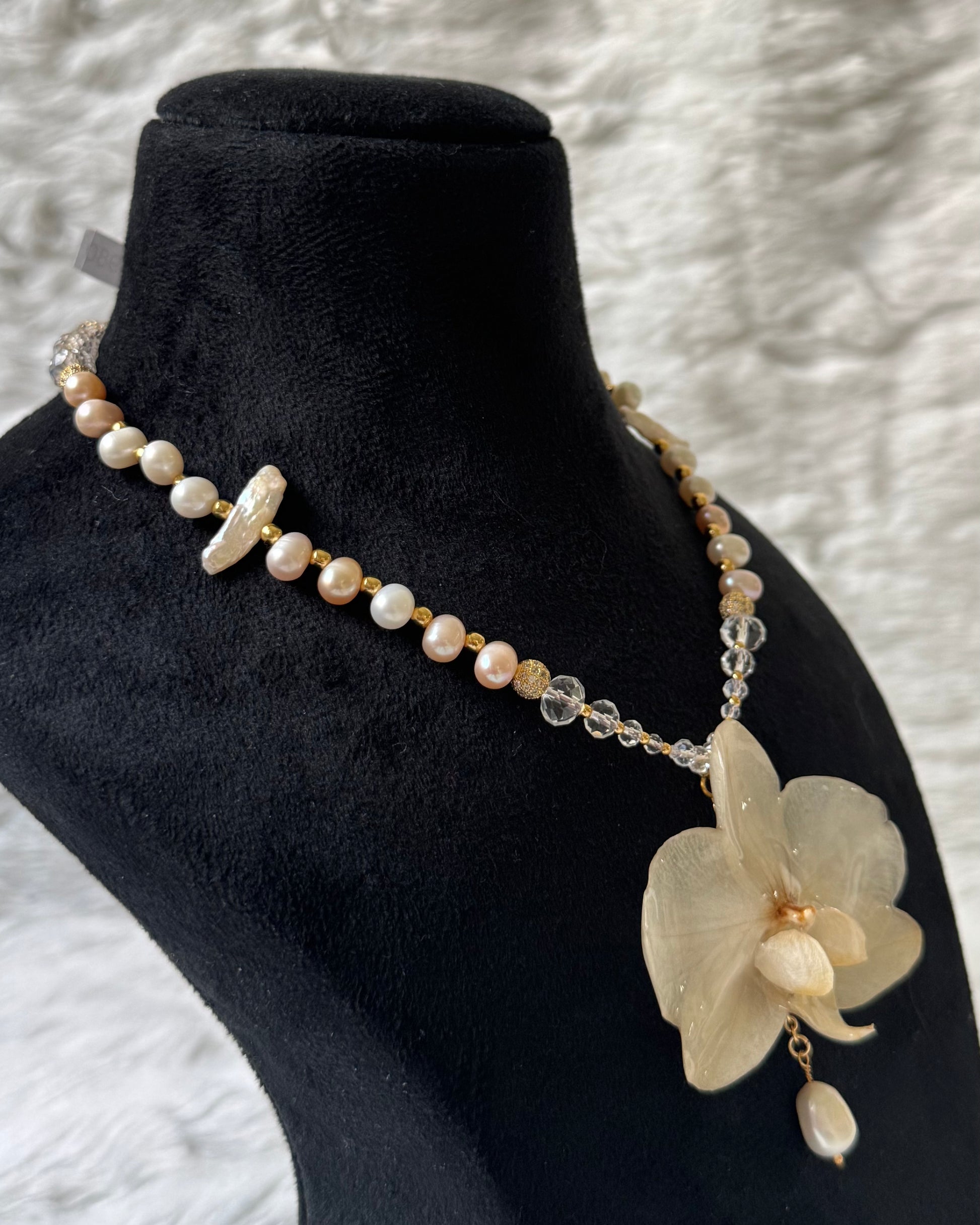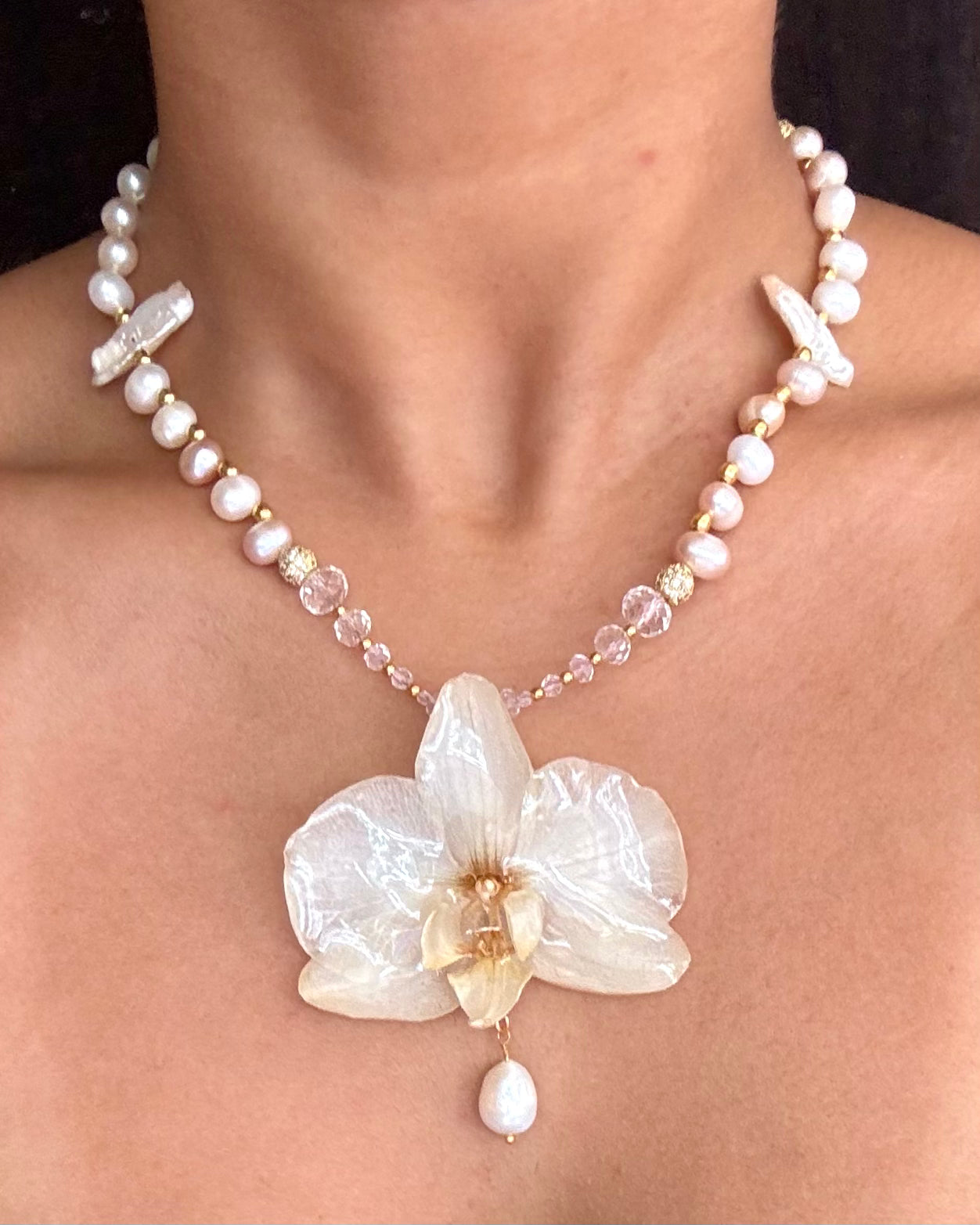 This necklace is made using a carefully preserved phalaenopsis orchid and features freshwater pearls, biwa pearls, gold-plated spacer beads, 24K gold-plated disco balls and Swarovski crystals.