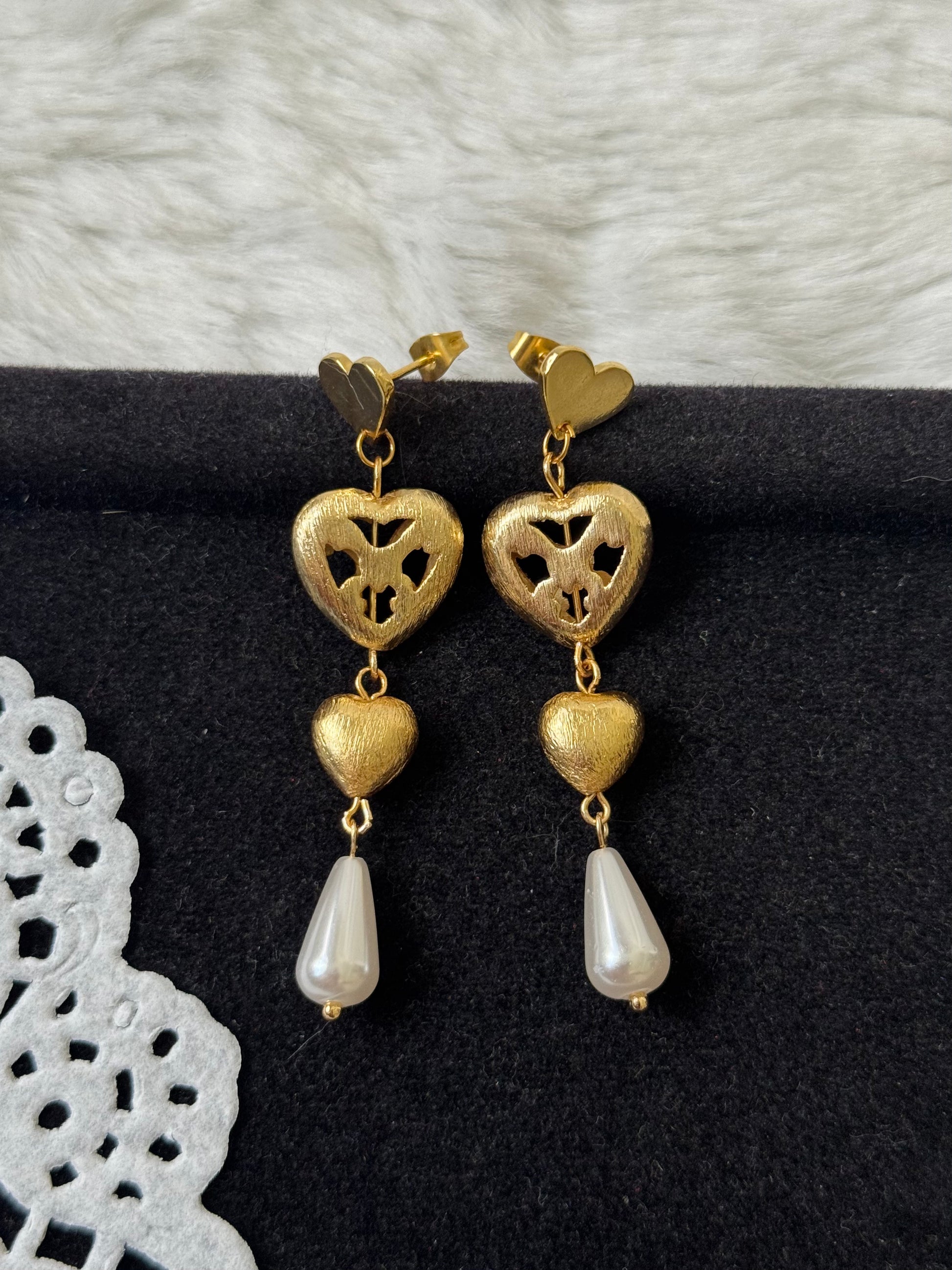 heart-shaped stud earrings with brushed beads and faux pearls.