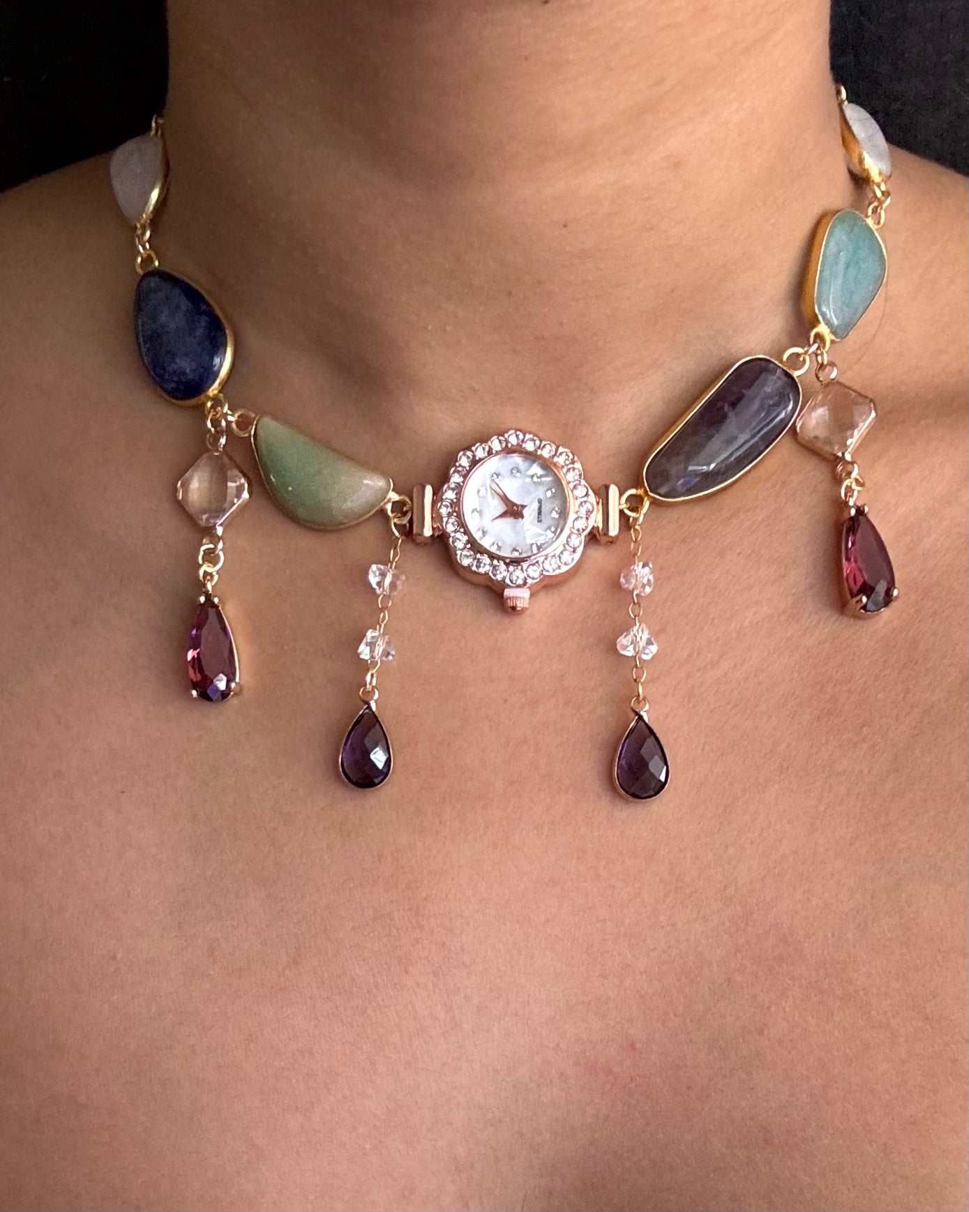 This beautiful choker necklace is made using a premium gold and zirconia-studded functional watch dial, glass-bezelled gemstones and gorgeous high-quality natural agate-bezelled stones.