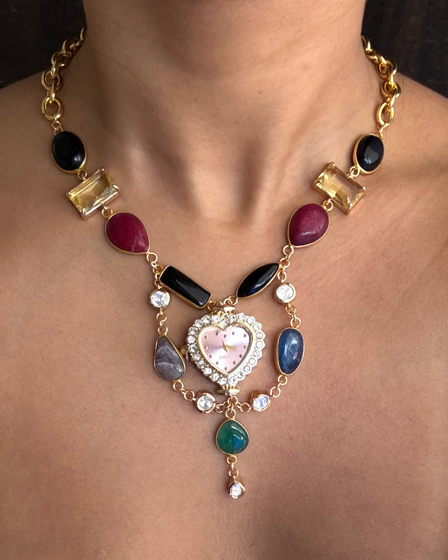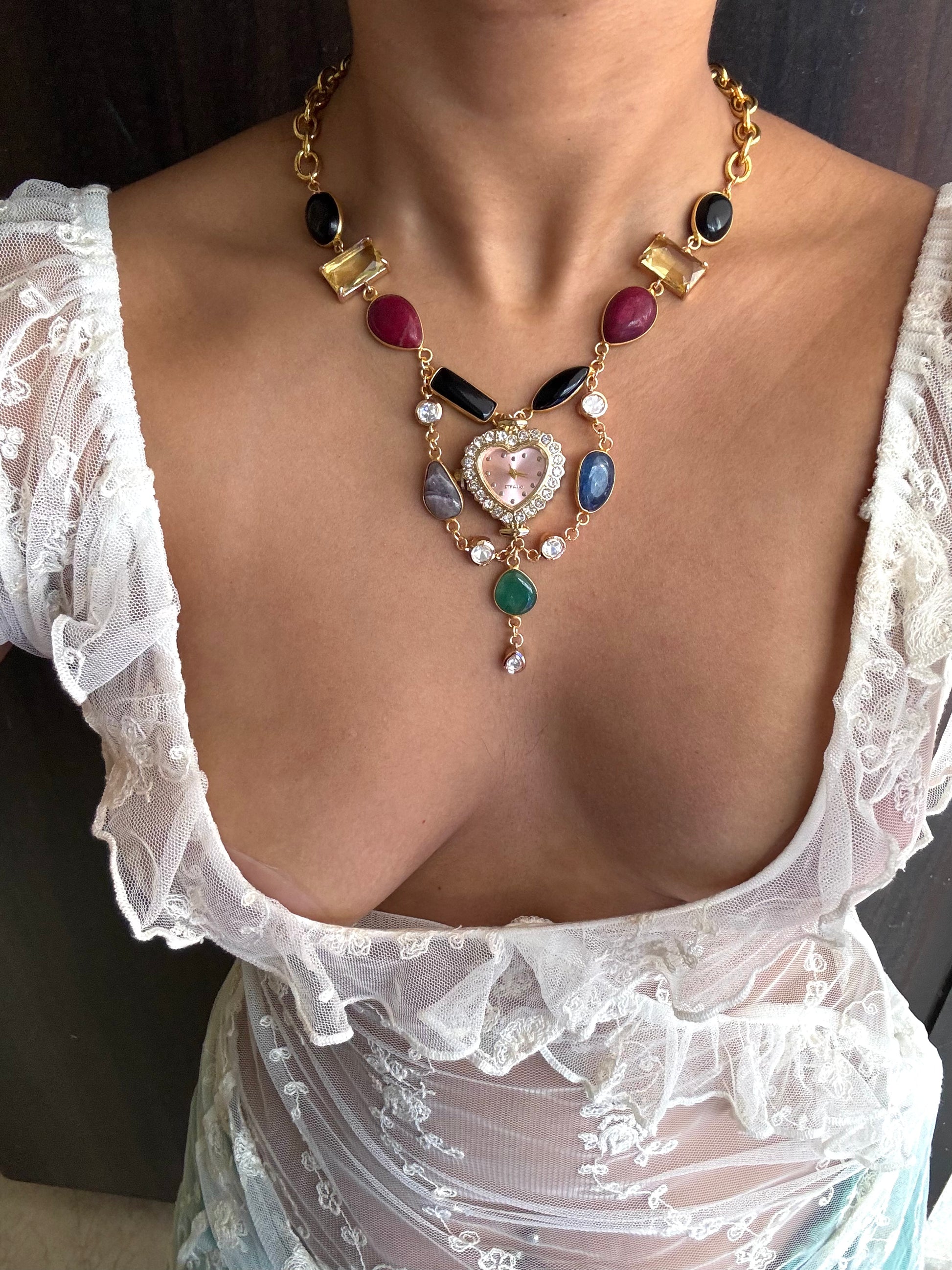 This beautiful choker necklace is made using a premium gold and zirconia-studded functional watch dial, glass-bezelled gemstones and gorgeous high-quality natural agate-bezelled stones.