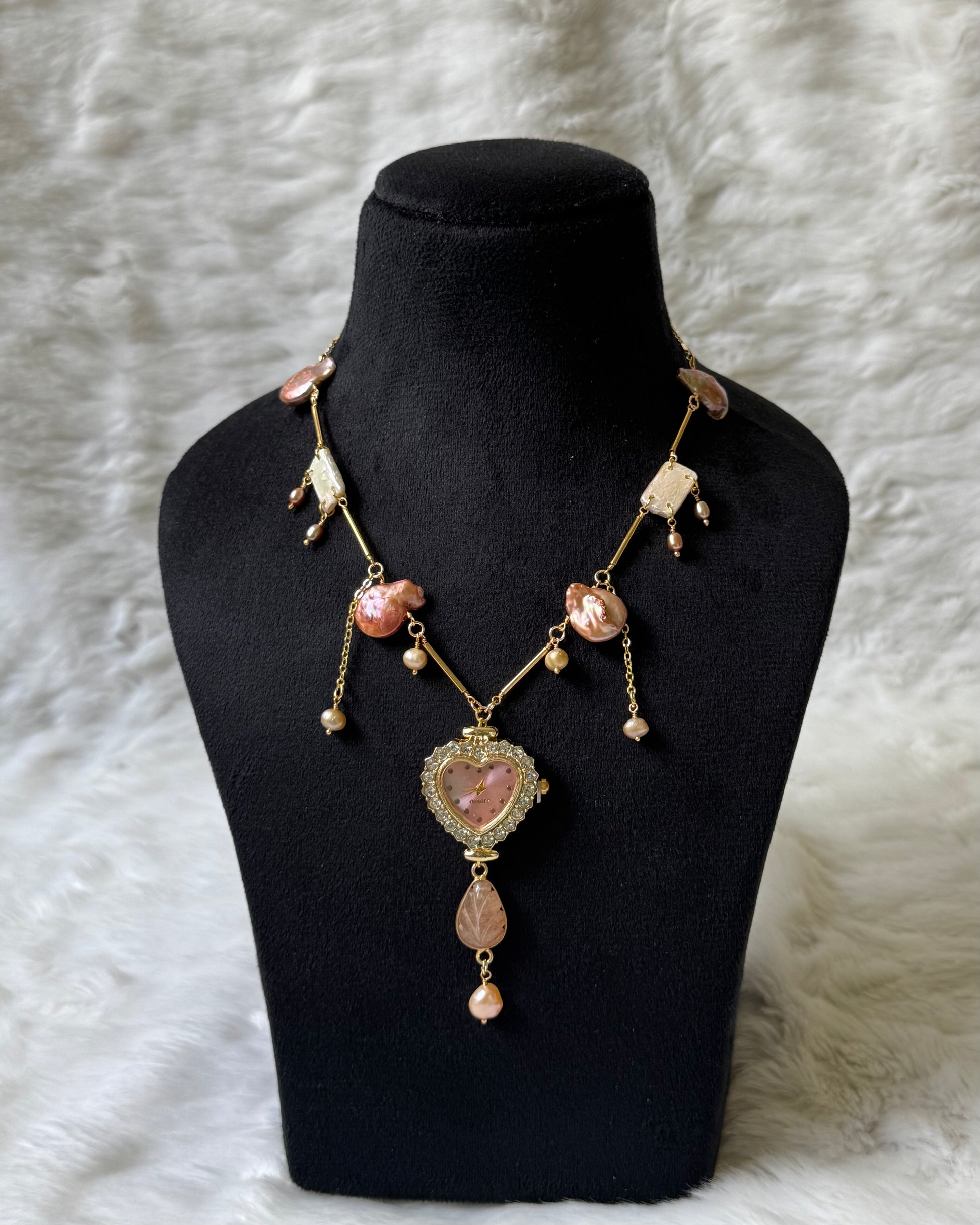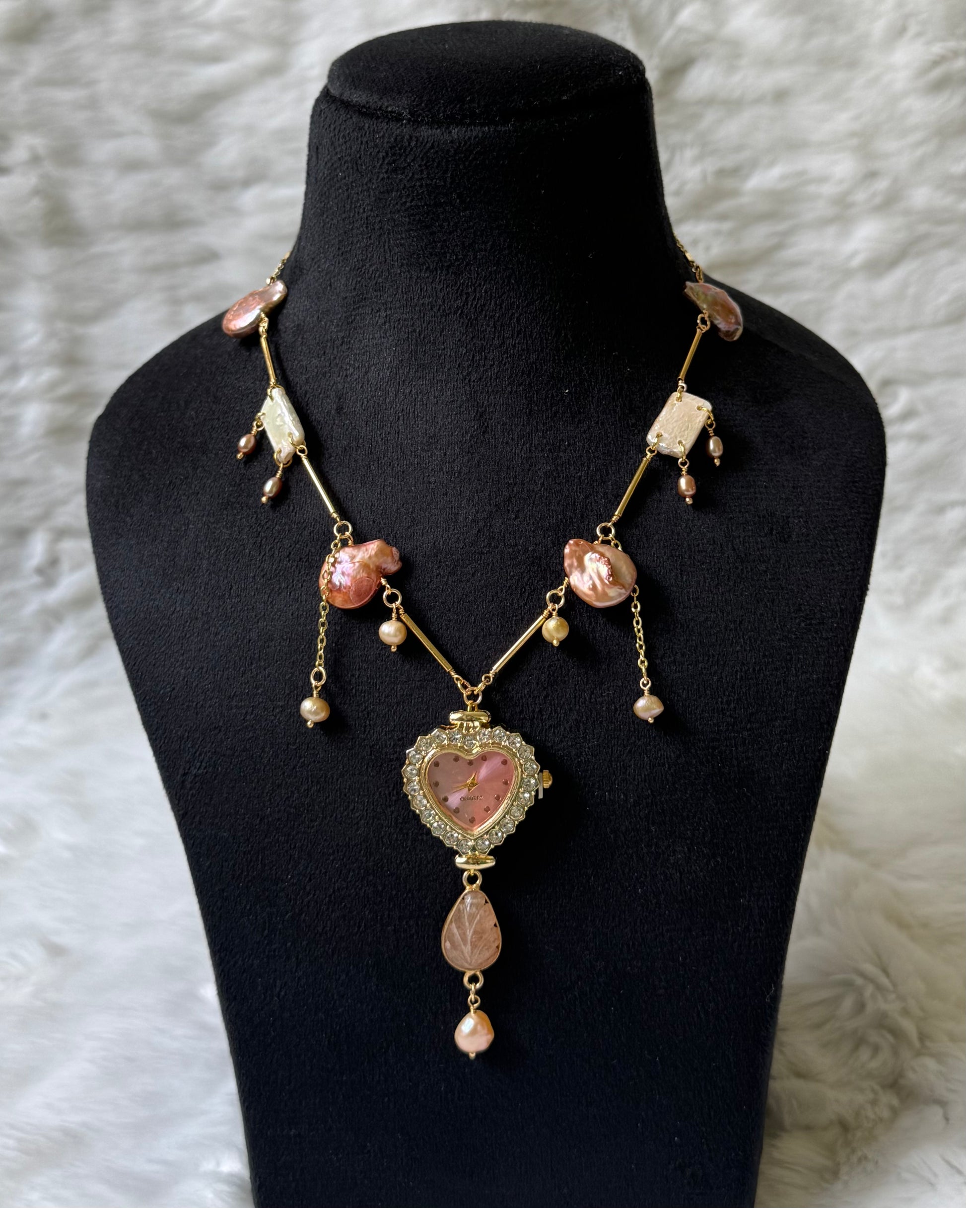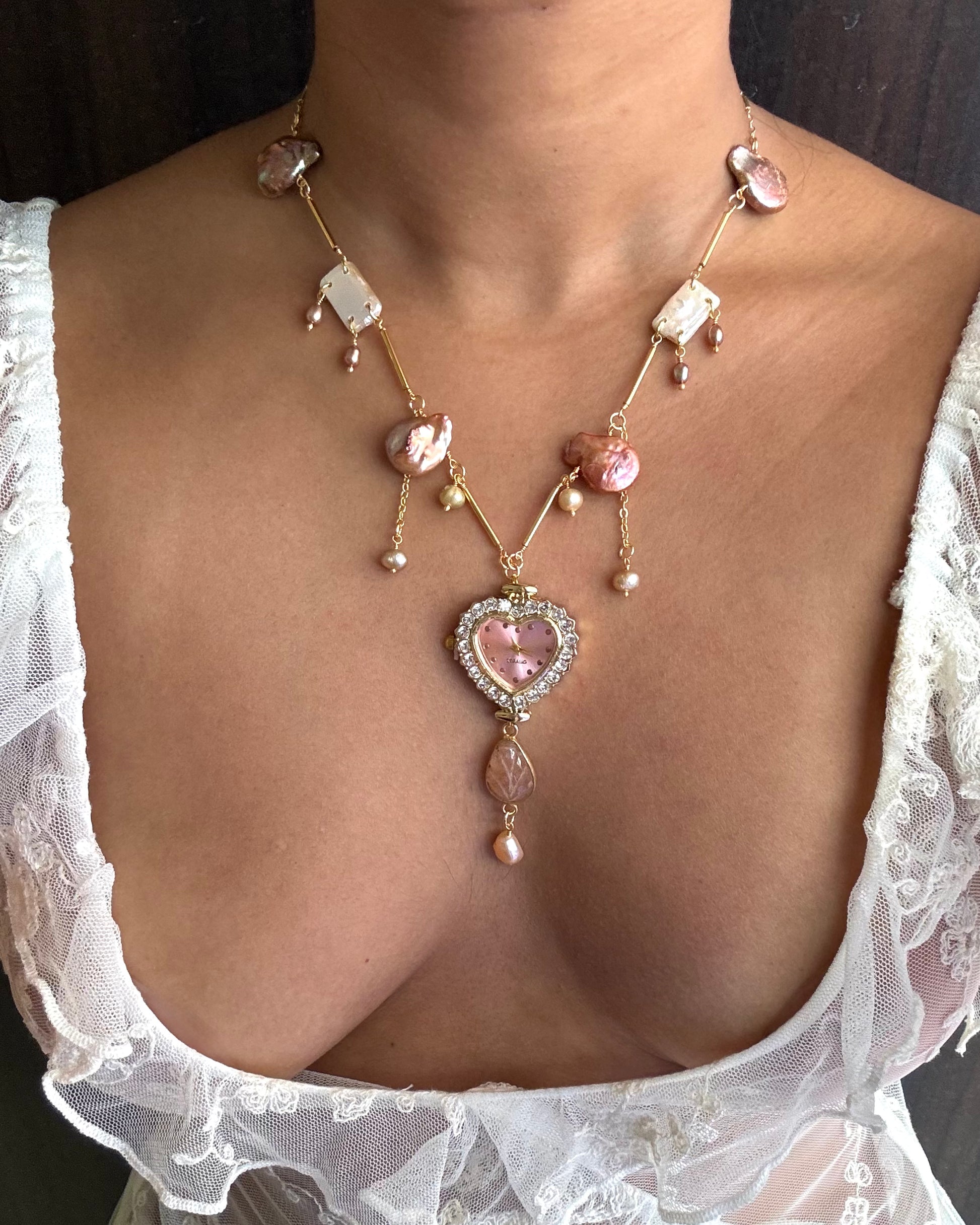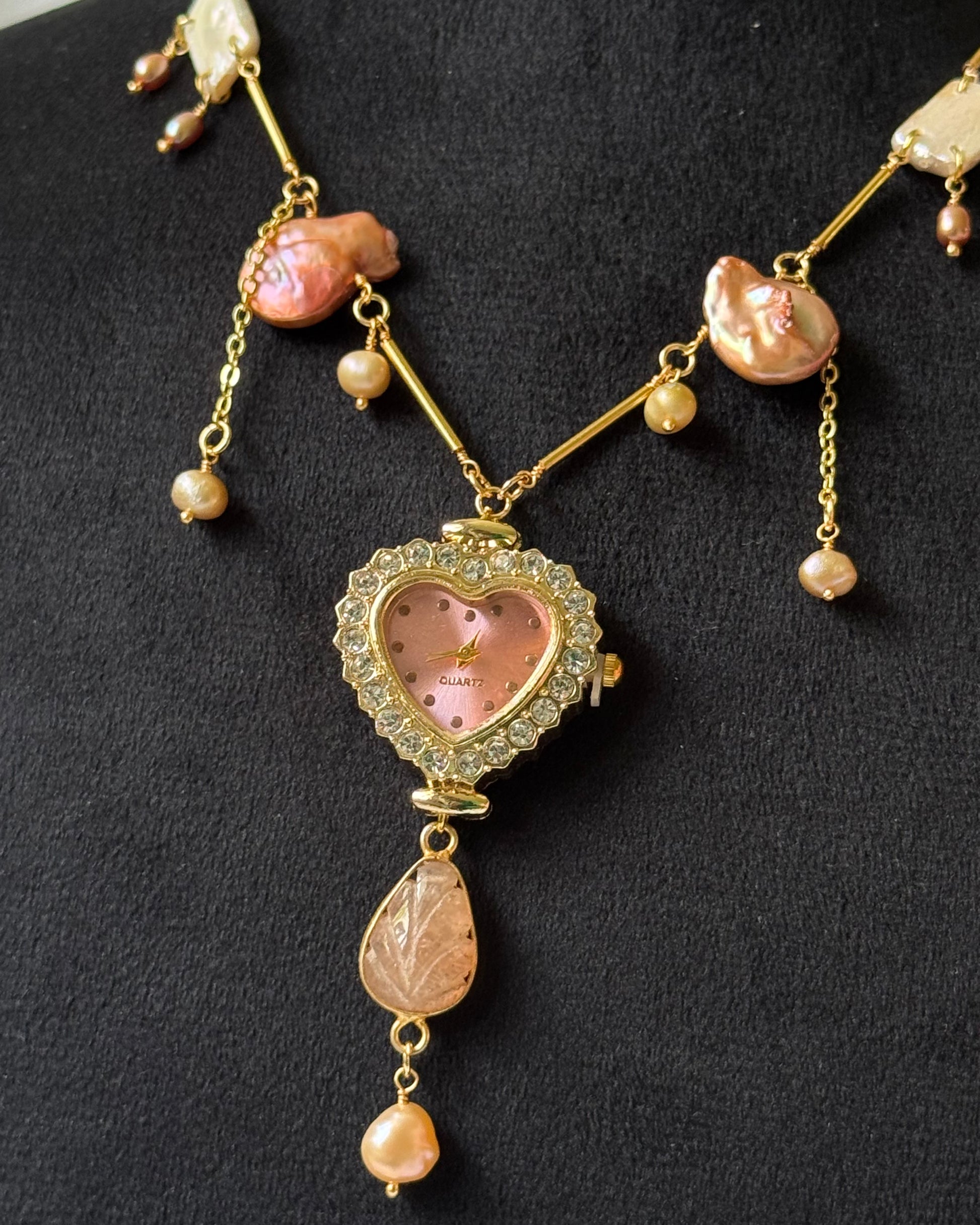 This necklace is made using a zircon-studded heart watch dial, peachy freshwater pearls, agate stone and gold-plated detailing.