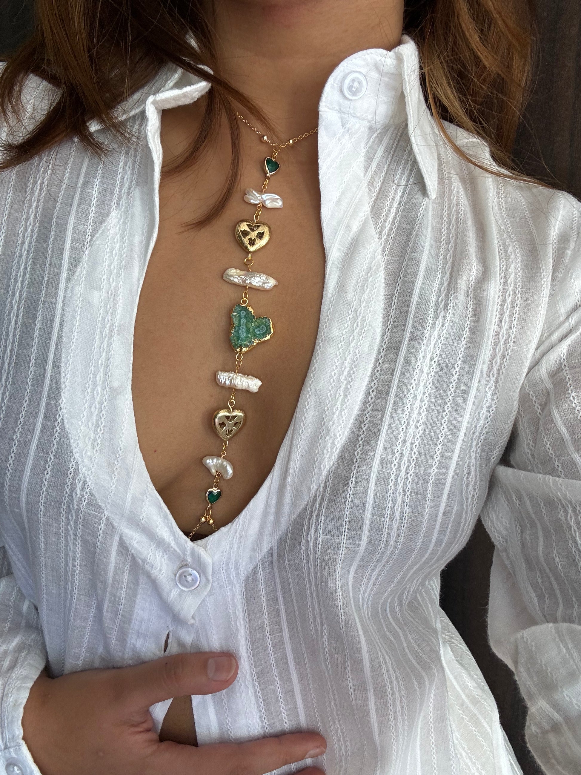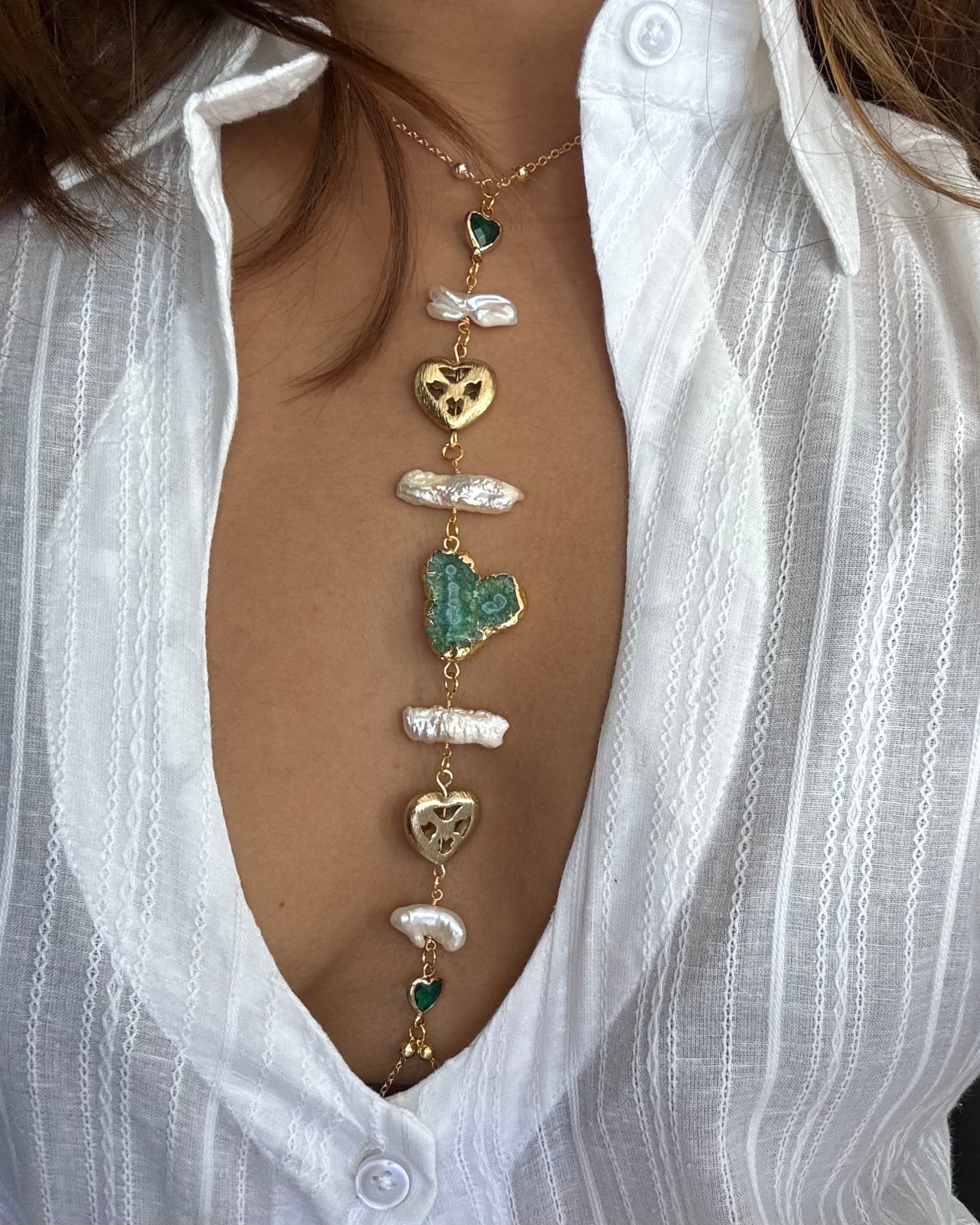 This body chain is made using gold-plated chain, freshwater biwa pearls, glass gemstones, brushed cut-out hearts and natural agate.
