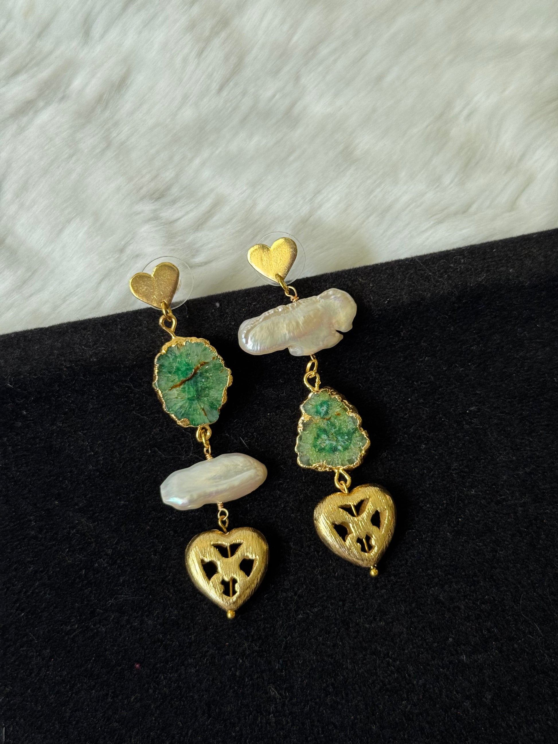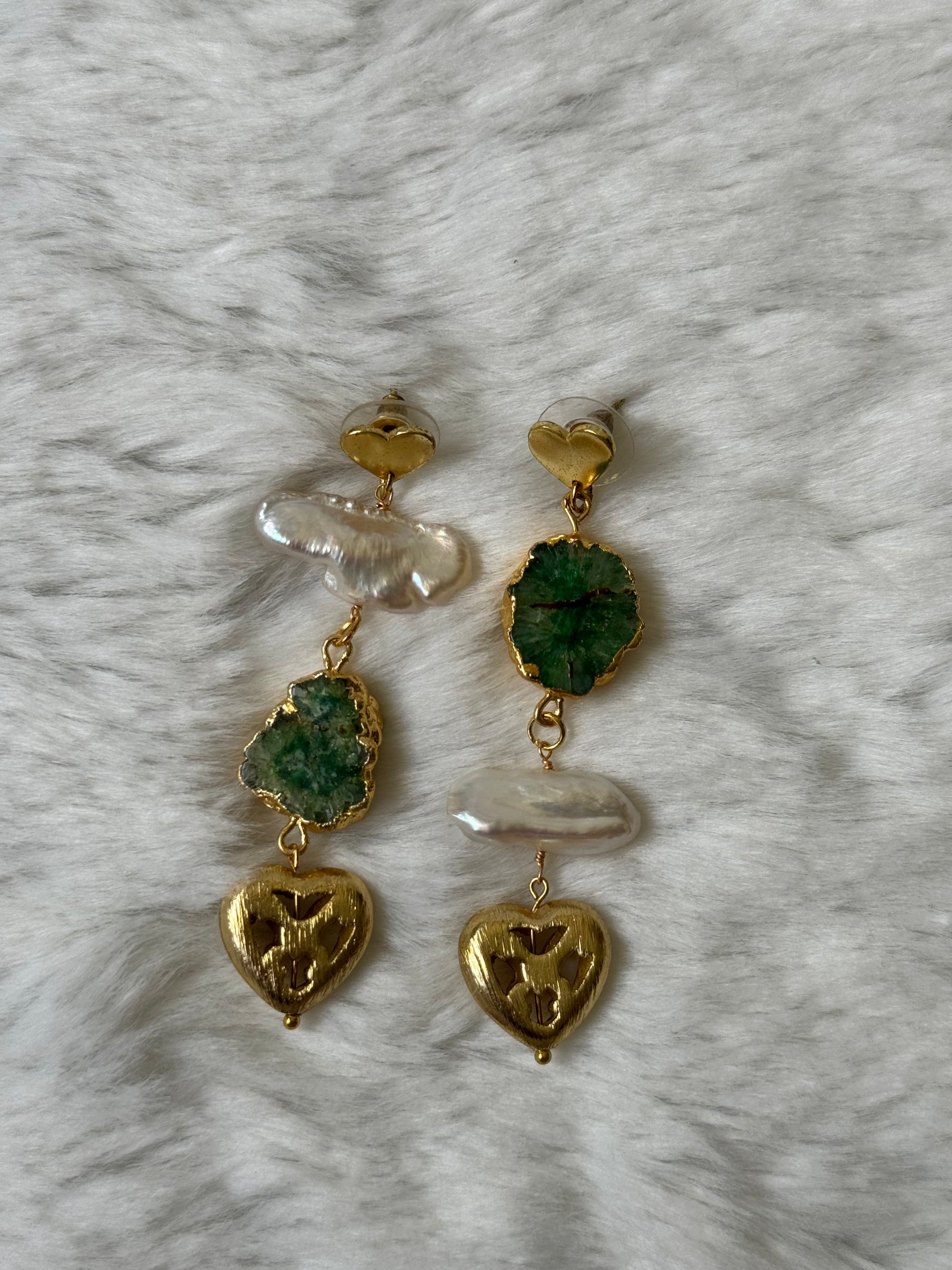gold-plated heart studs with green geodes, biwa pearls and brushed cut-detail heart hanging.
