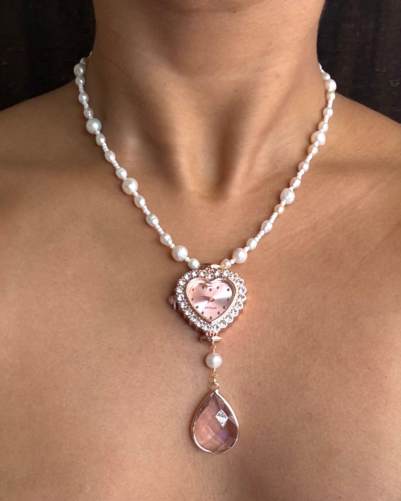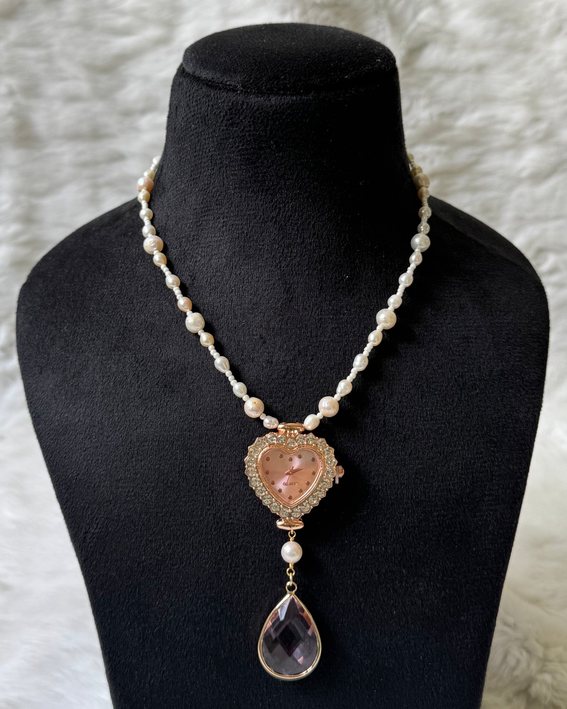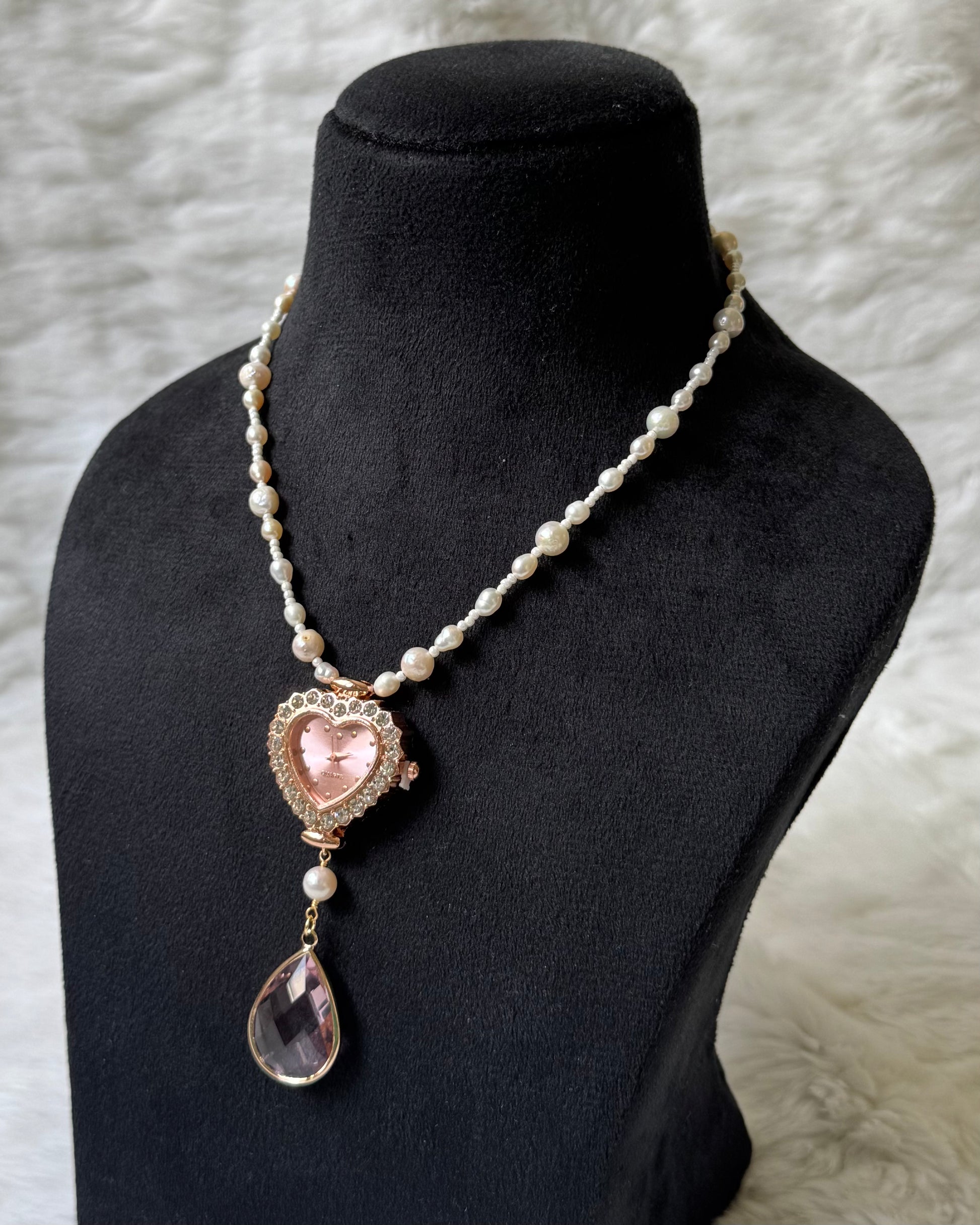 This necklace is made using a zircon-studded heart watch dial, freshwater pearls, pink glass bezelled gemstone.