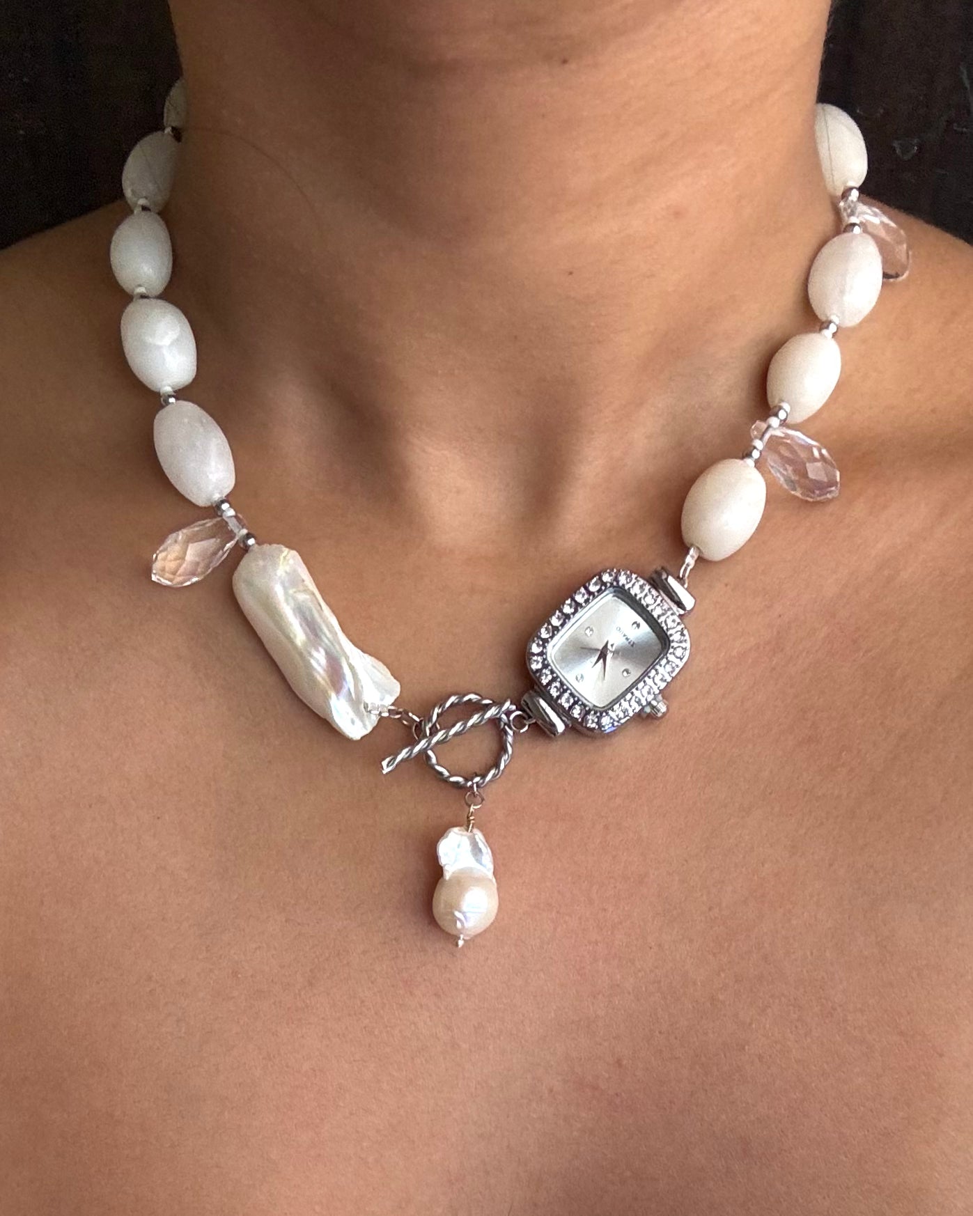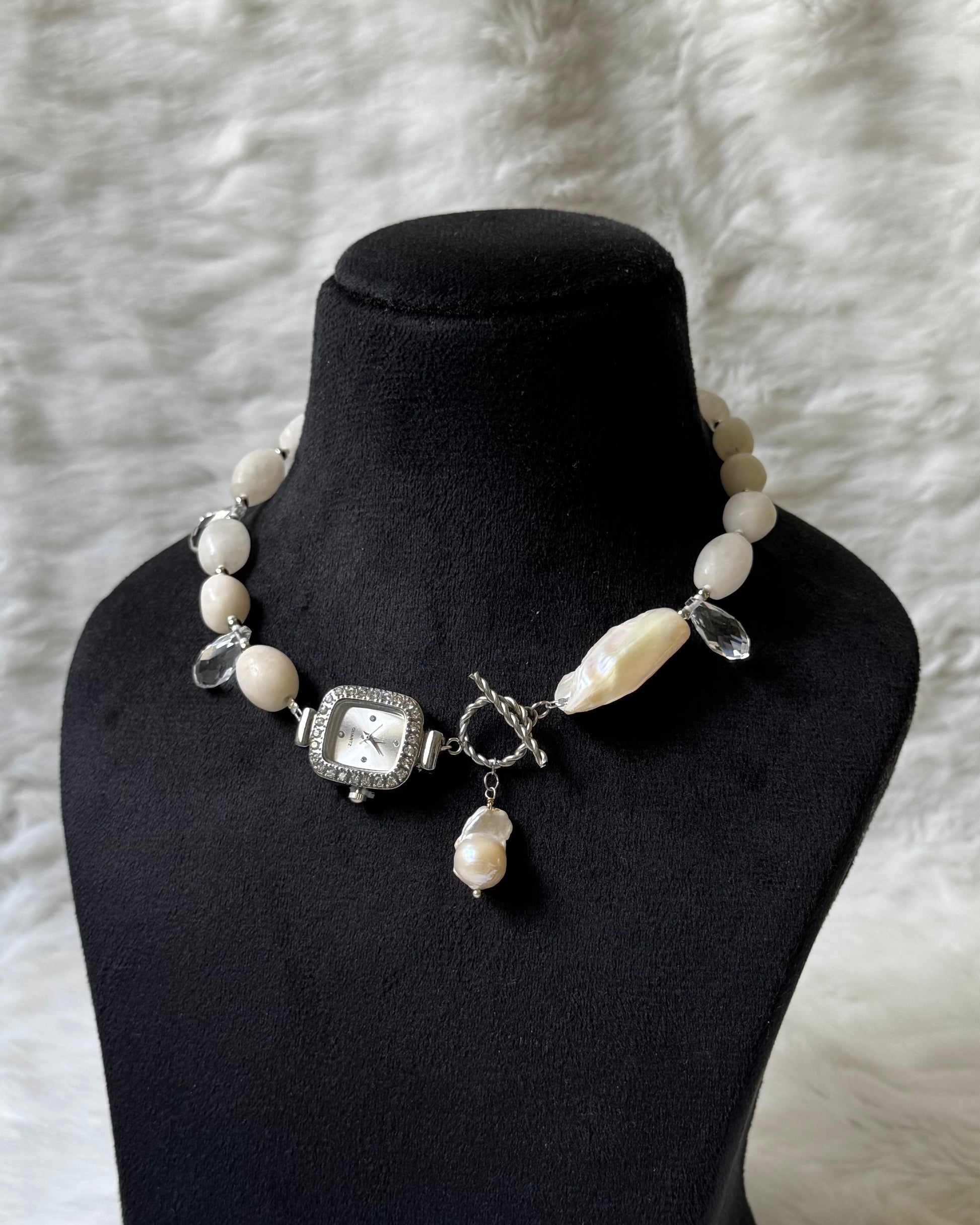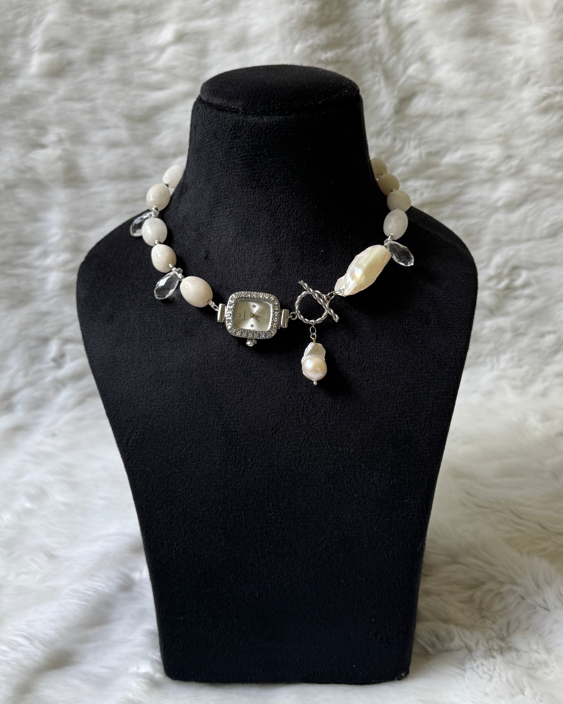 This necklace is made using a zircon-studded watch dial, milky agate stone beads, stainless steel details and swarovski faceted crystals.
