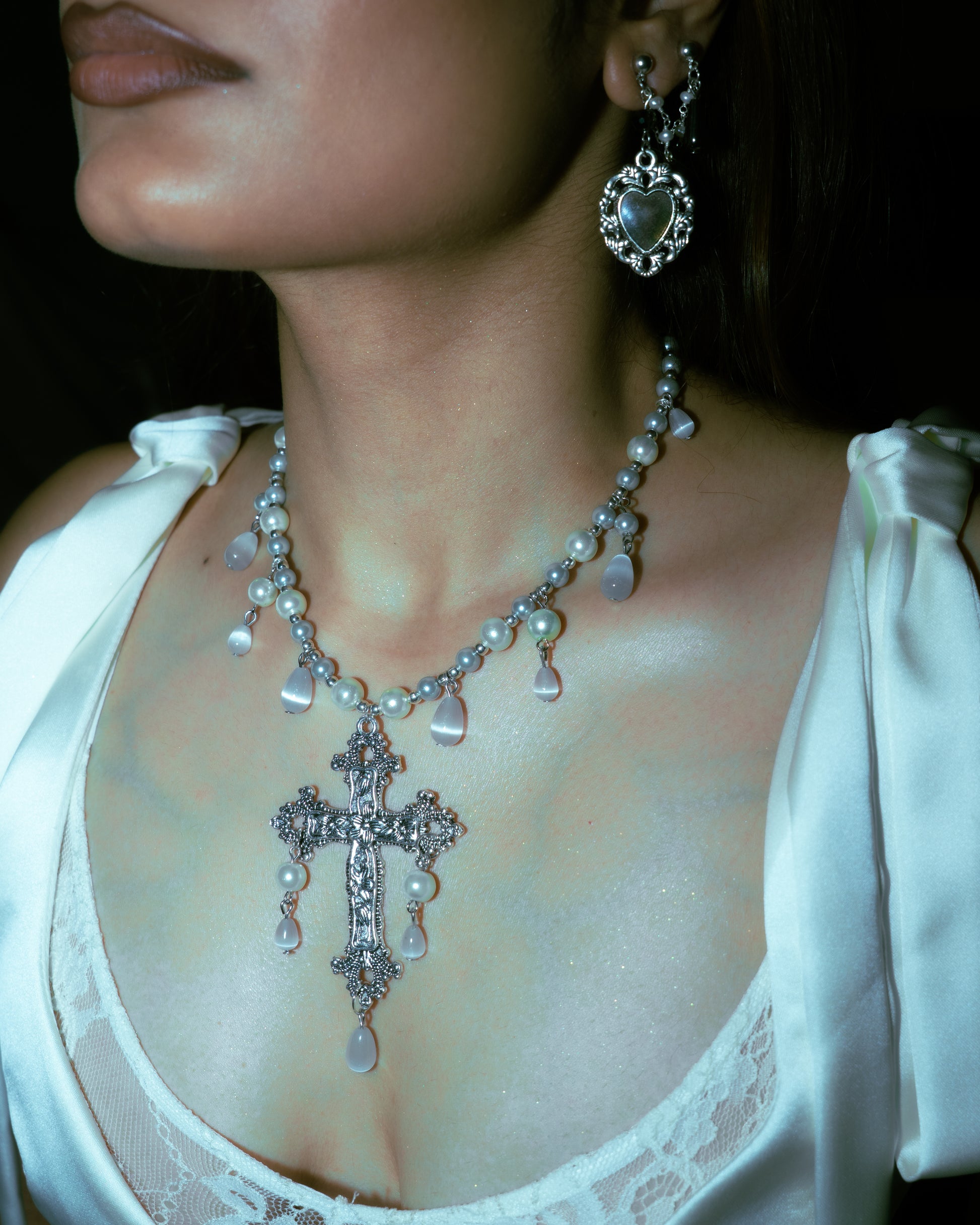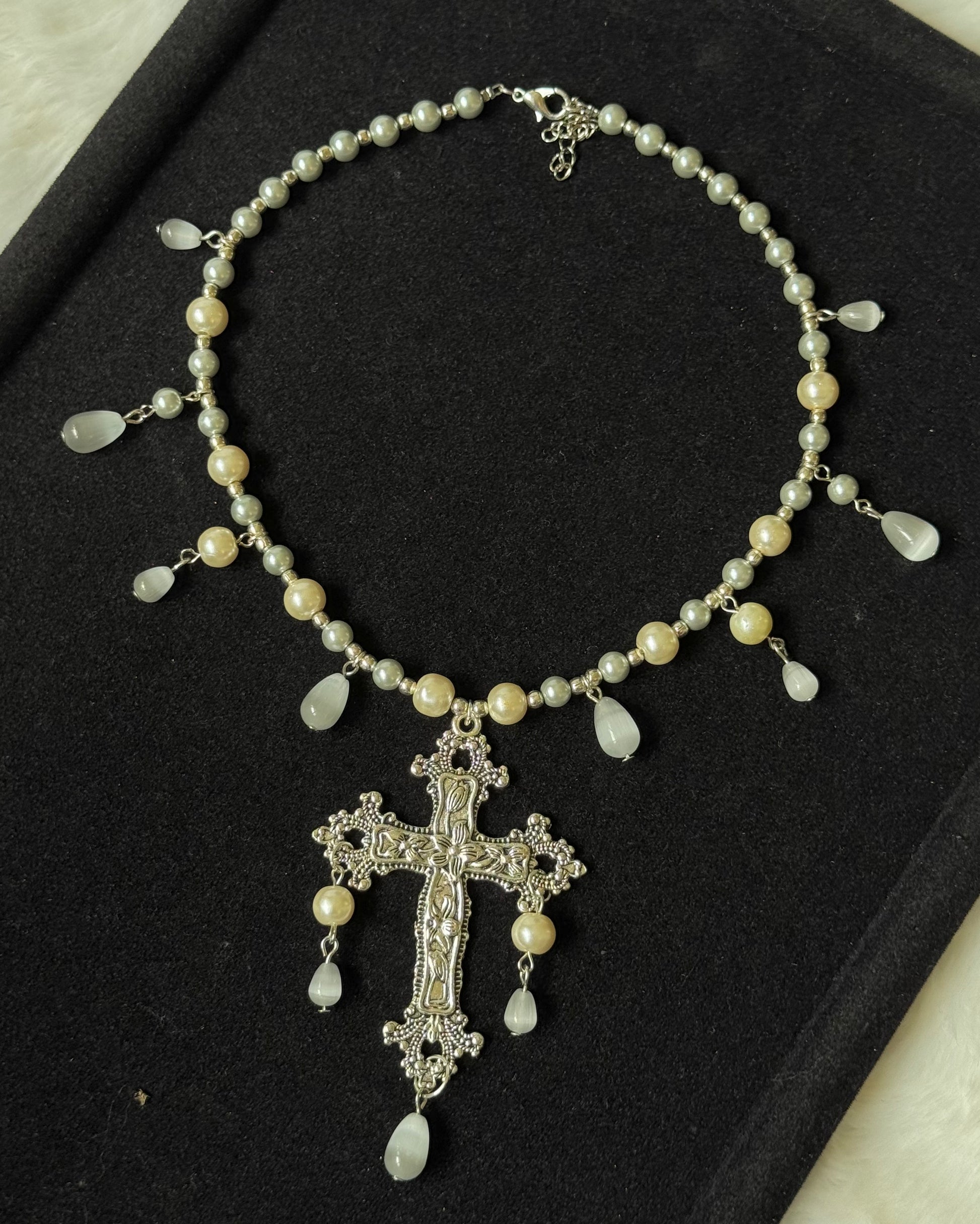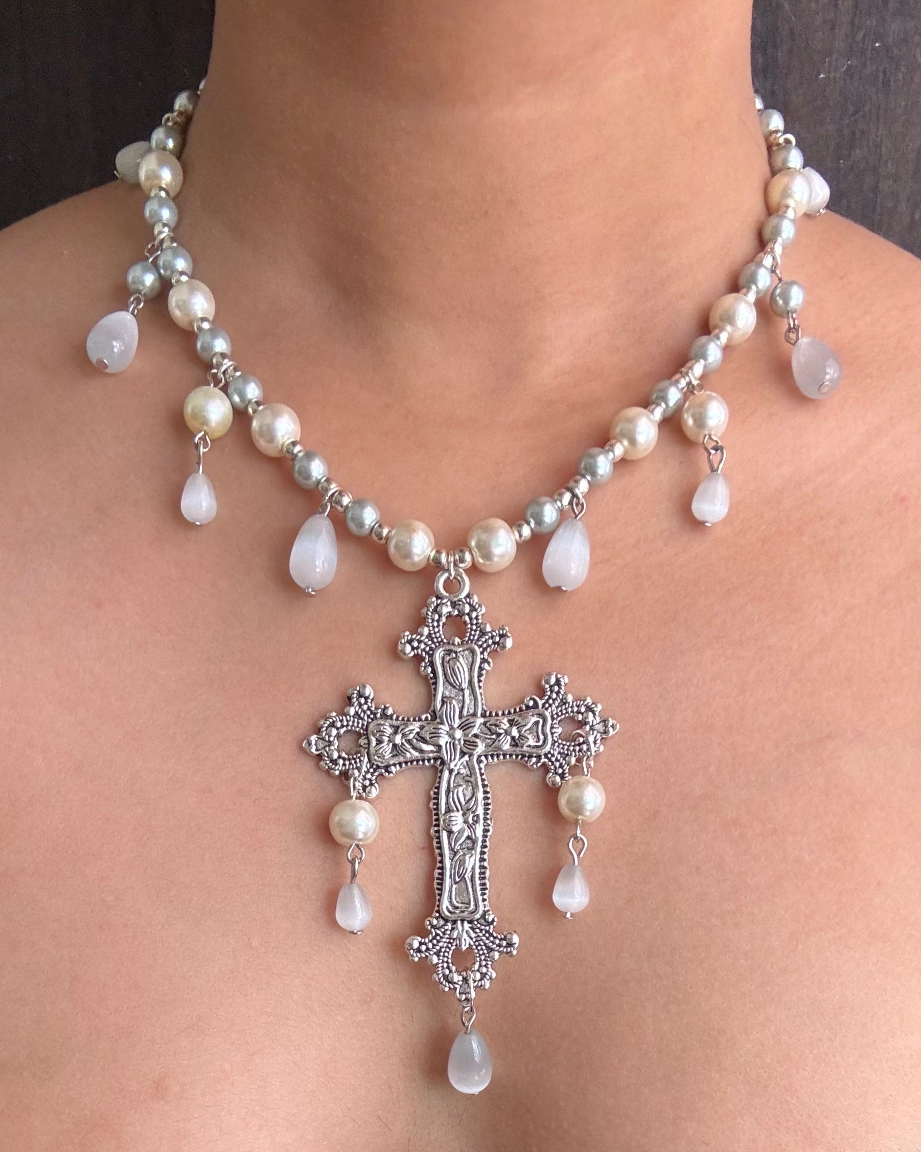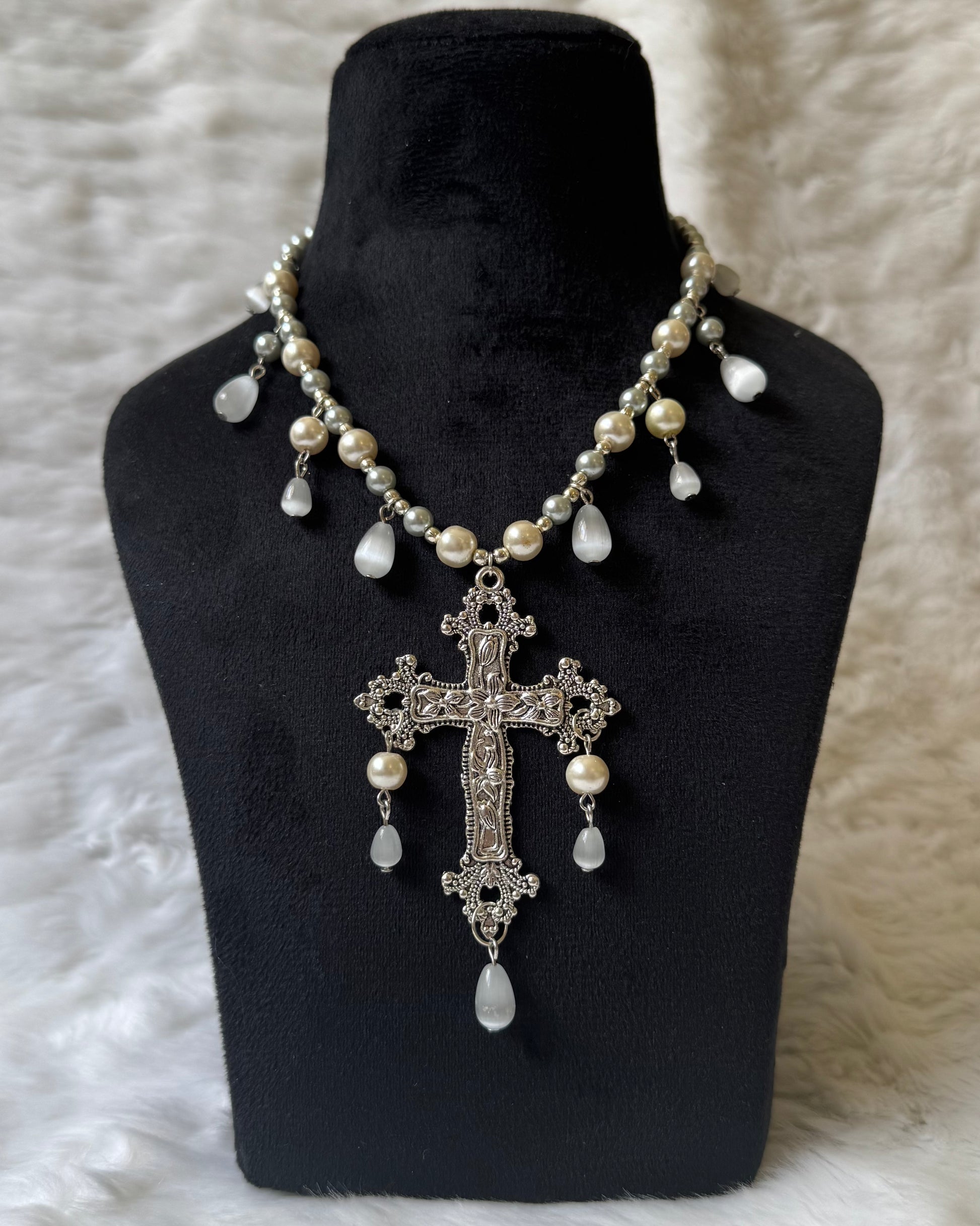 White Pearls, Grey Pearls, and Monalisa Drops Grand XL Cross Necklace.