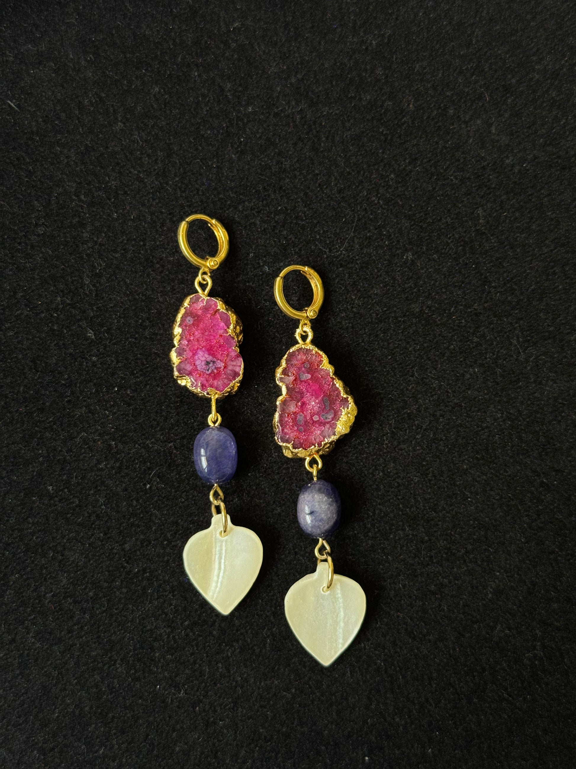 pink geode earrings with lapiz lazuli crystals and a seashell heart charm on huggies.