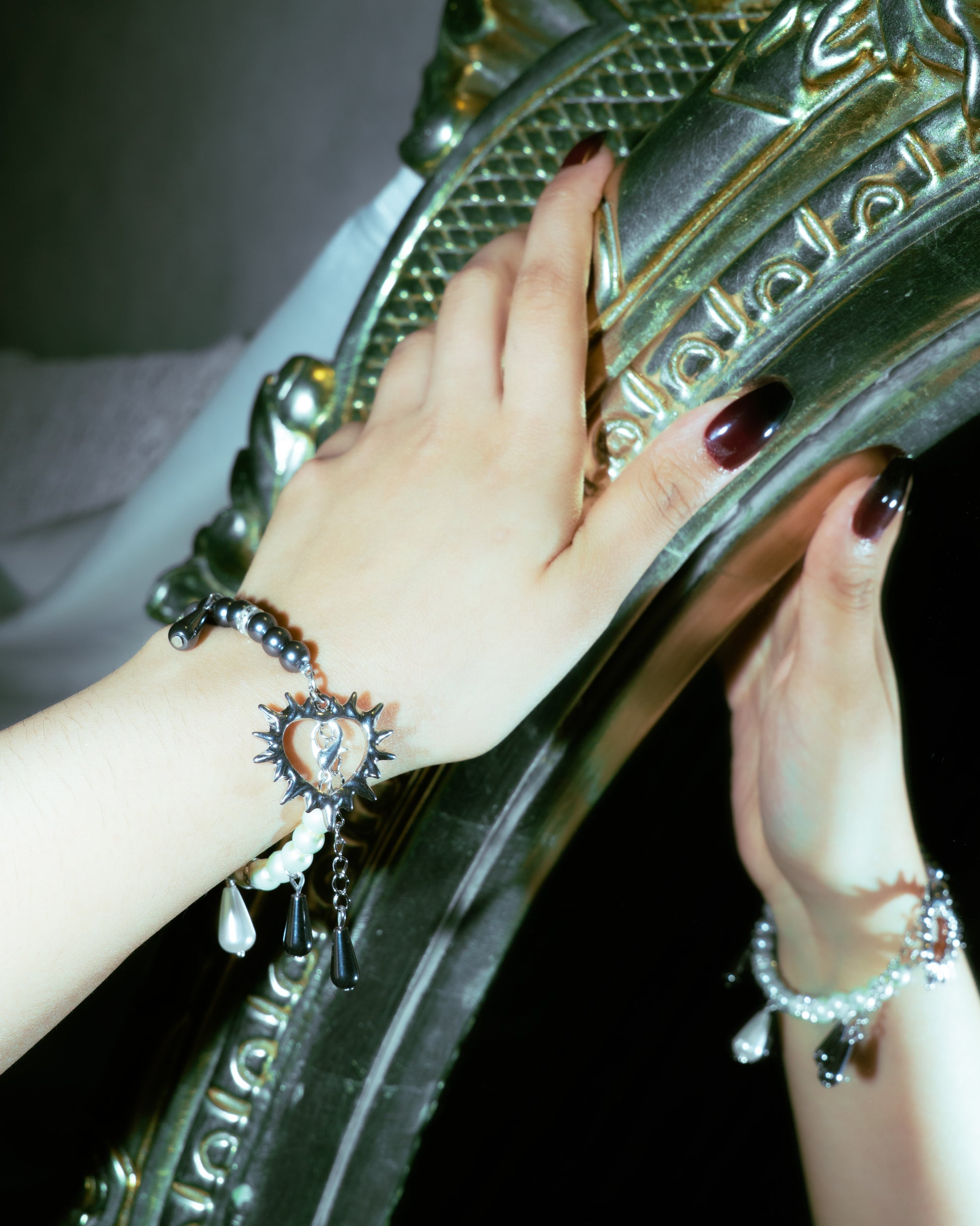Bracelet made using 5 colours of Swarovski Pearls to achieve a gorgeous colour gradient from white to dark grey alongside detailing with grey and pearl drops and a goth-y heart charm made of stainless steel.