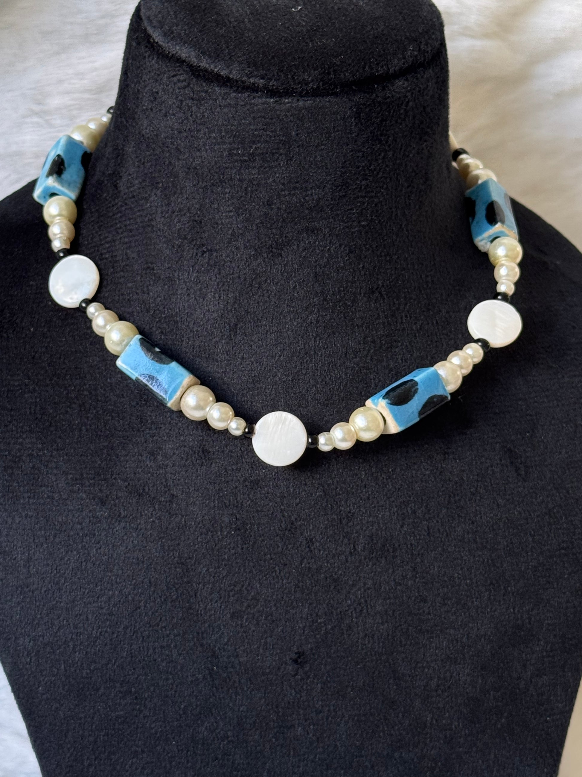 Faux pearl necklace with hand painted ceramic beads