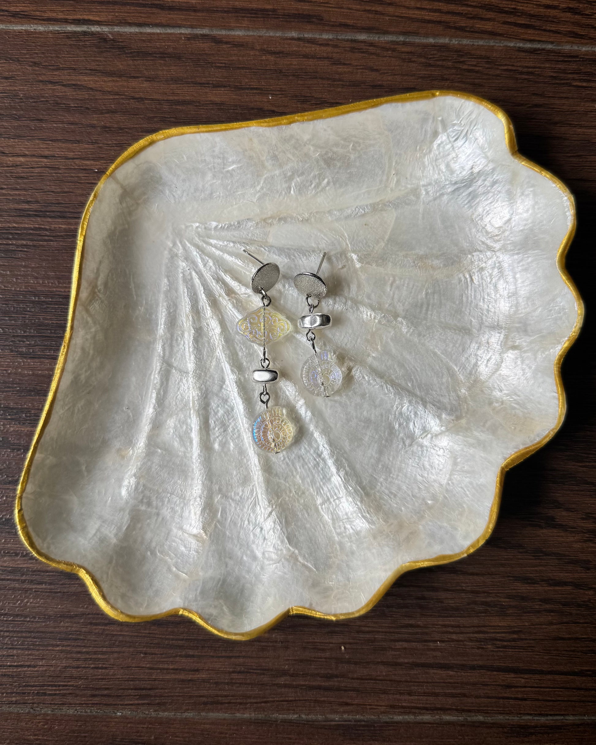 These earrings are made using iridescent cloud and conch beads, silver stainless steel beads, and stainless steel studs.
