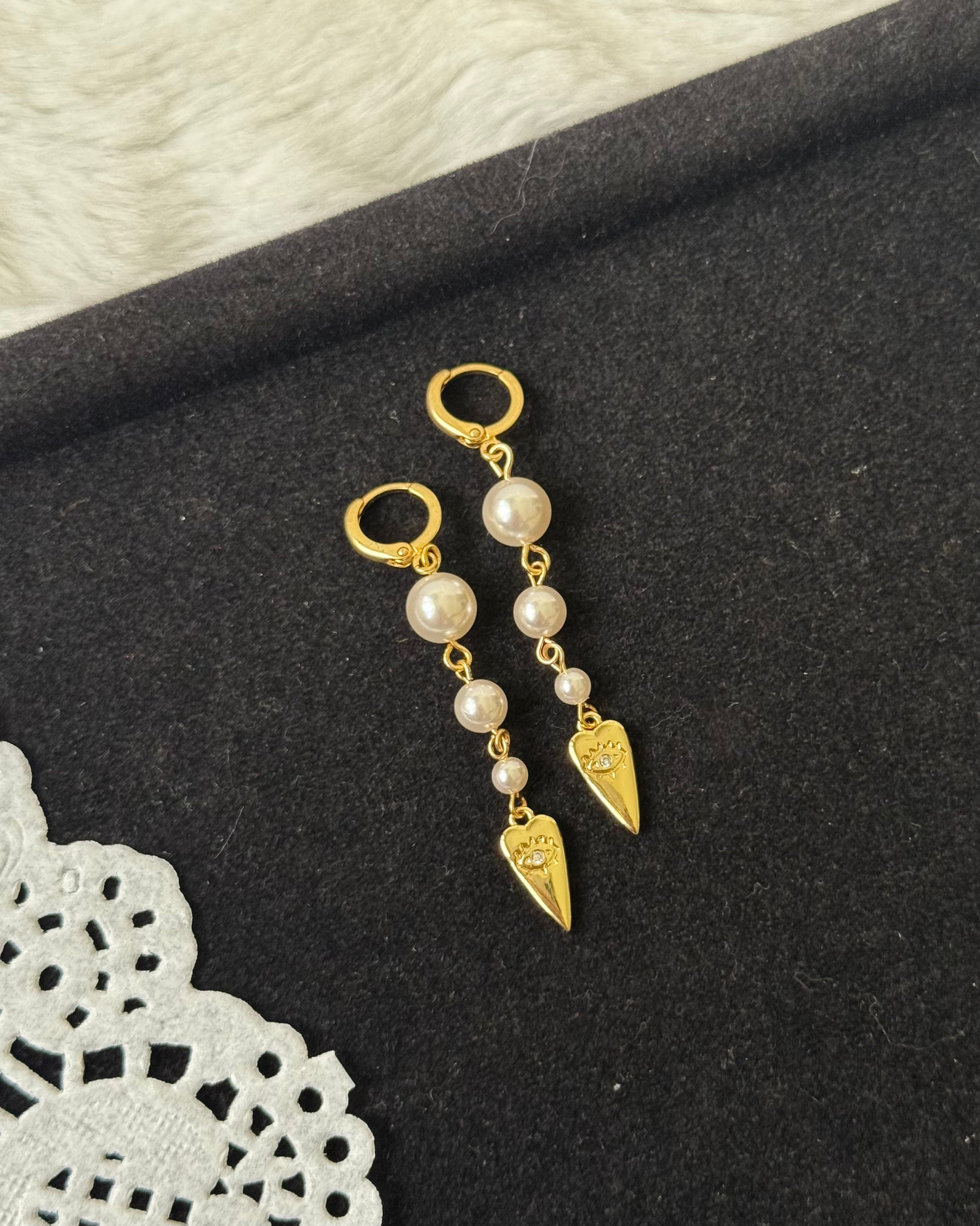 huggie earrings with glass-grade faux pearls and 24K gold-plated talisman-style charms.