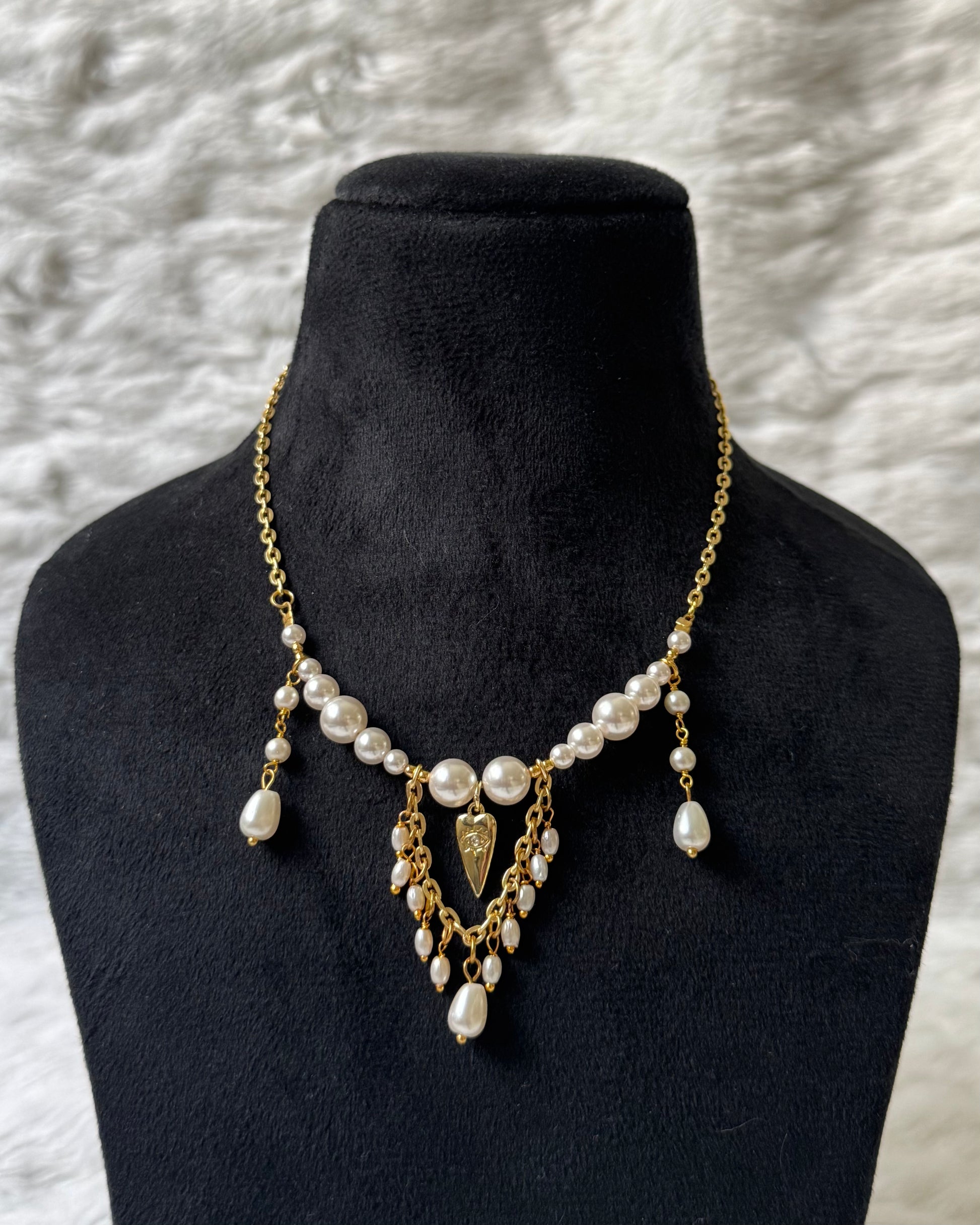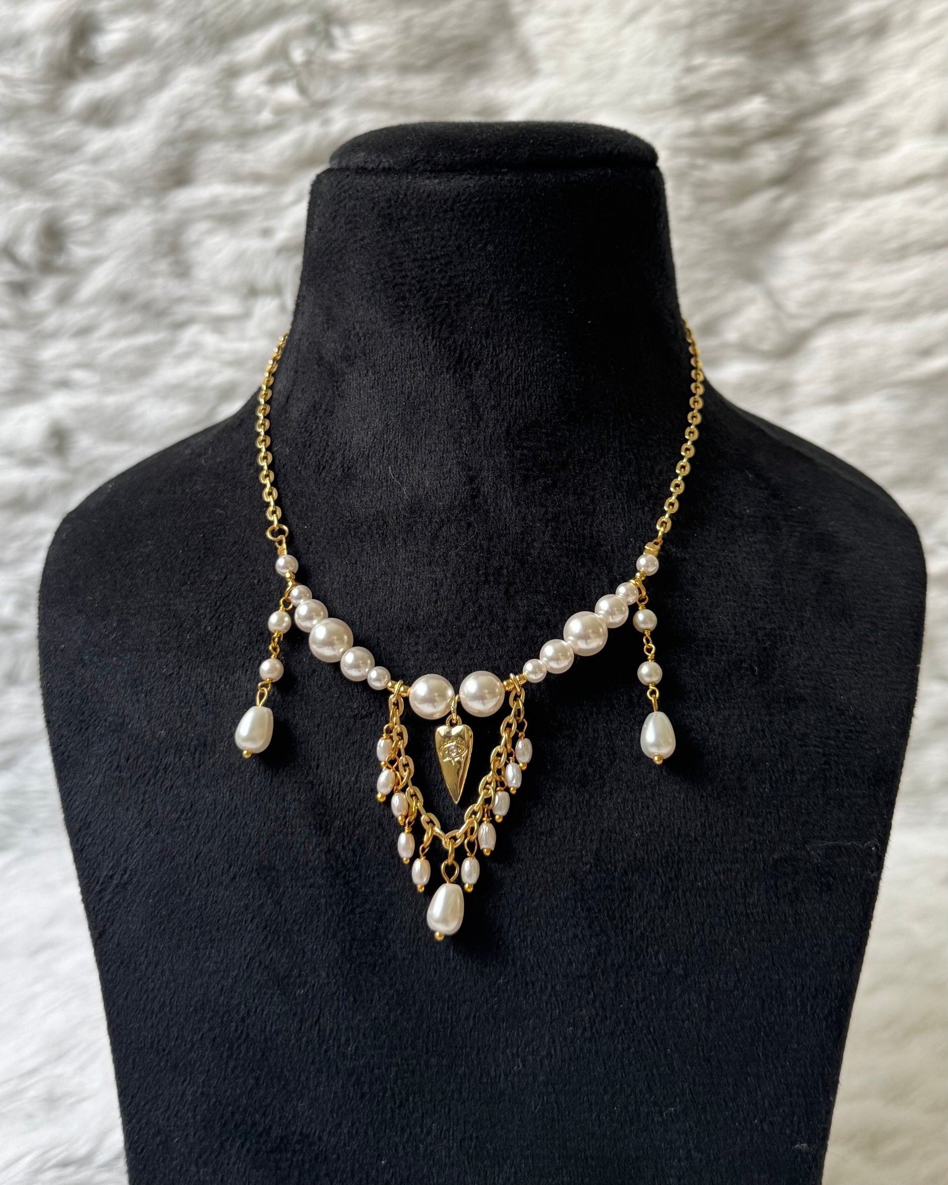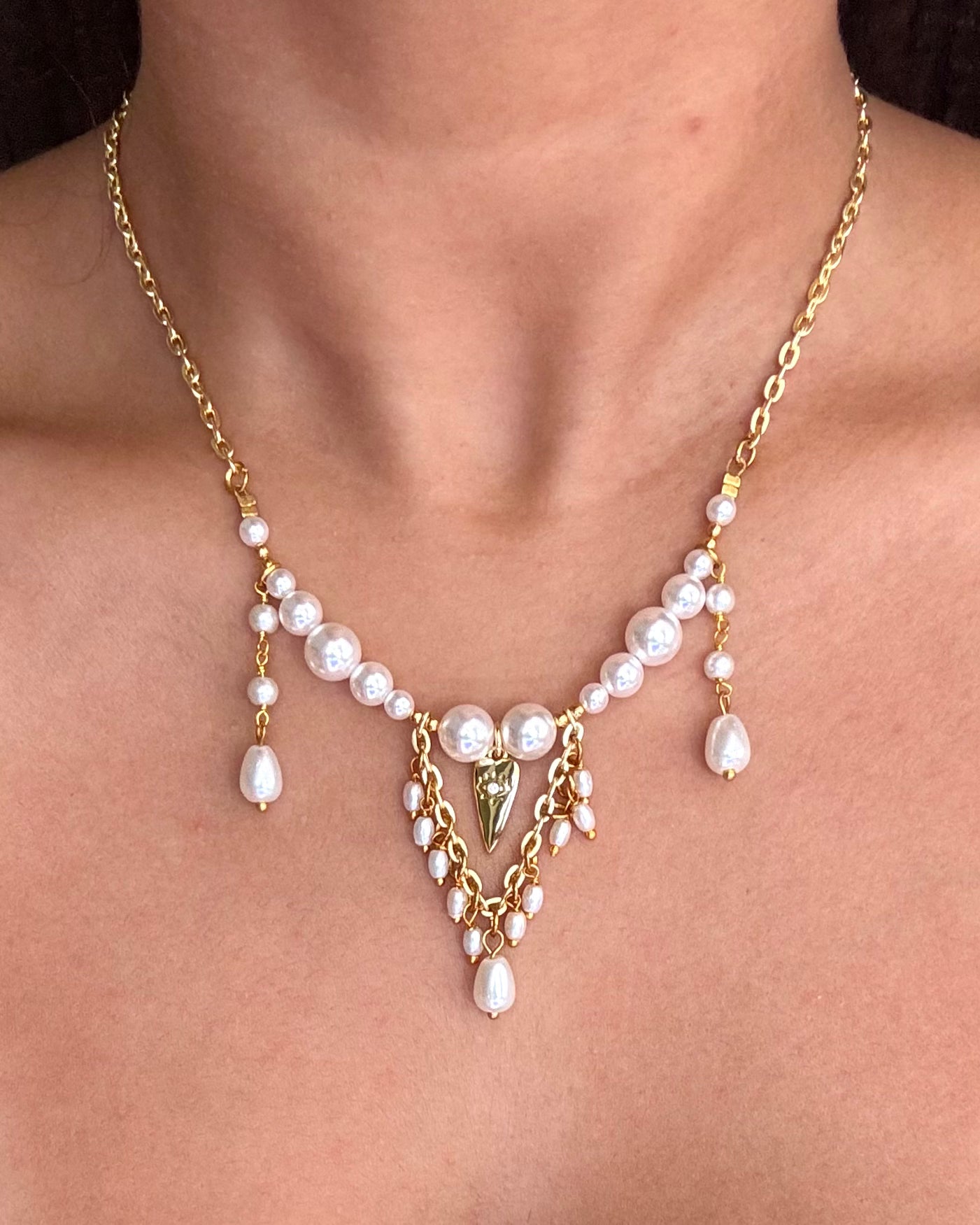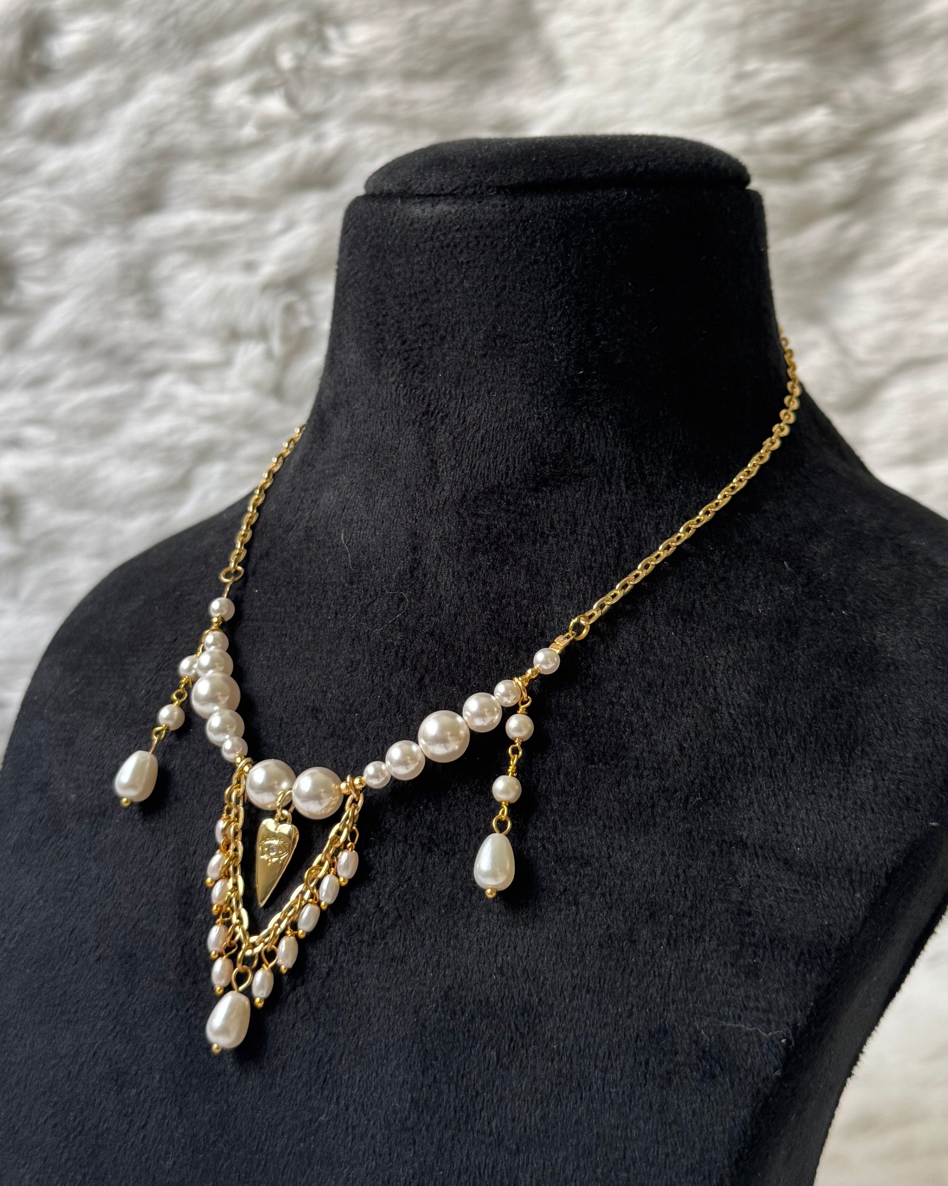Minimal but still statement-like necklace with glass-grade faux pearls and 24K gold-plated talisman-style charm and gold plated chains.