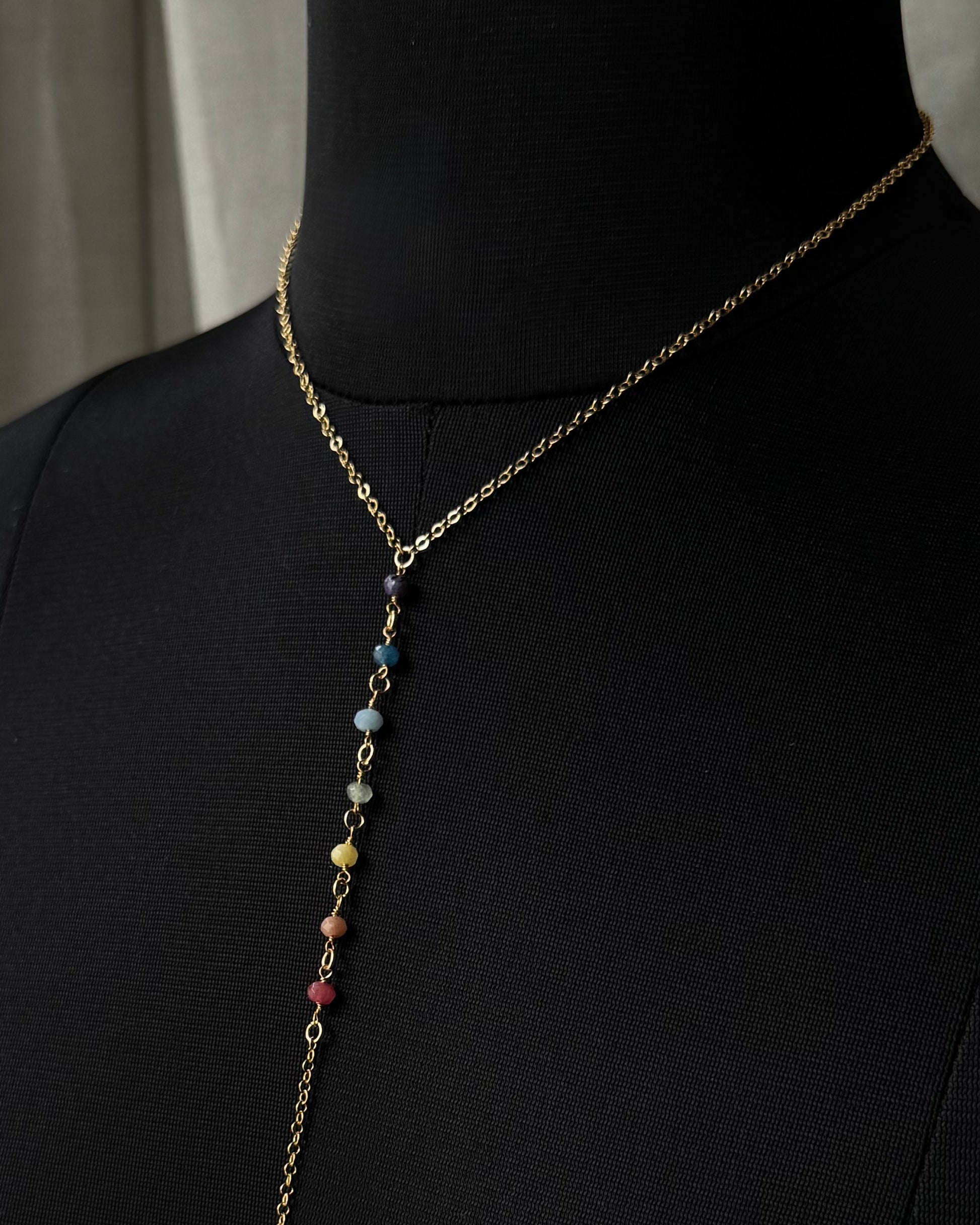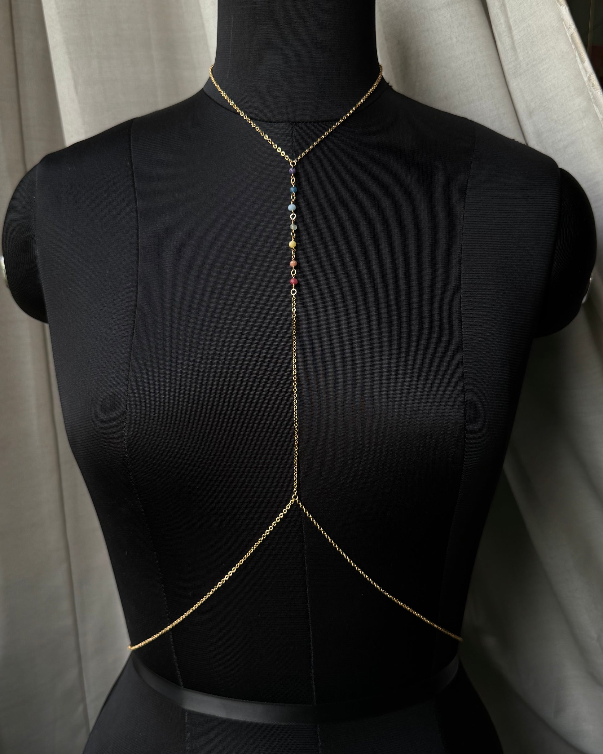 This body chain is made using a gold-plated chain and 7 chakra-representative agate beads.
