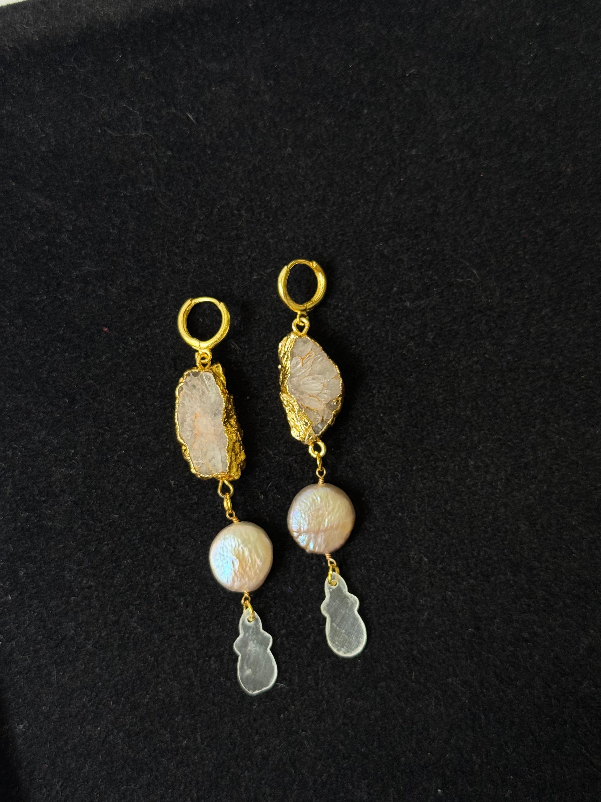 neutral geode earring huggies with freshwater coin pearl and seashell charms.